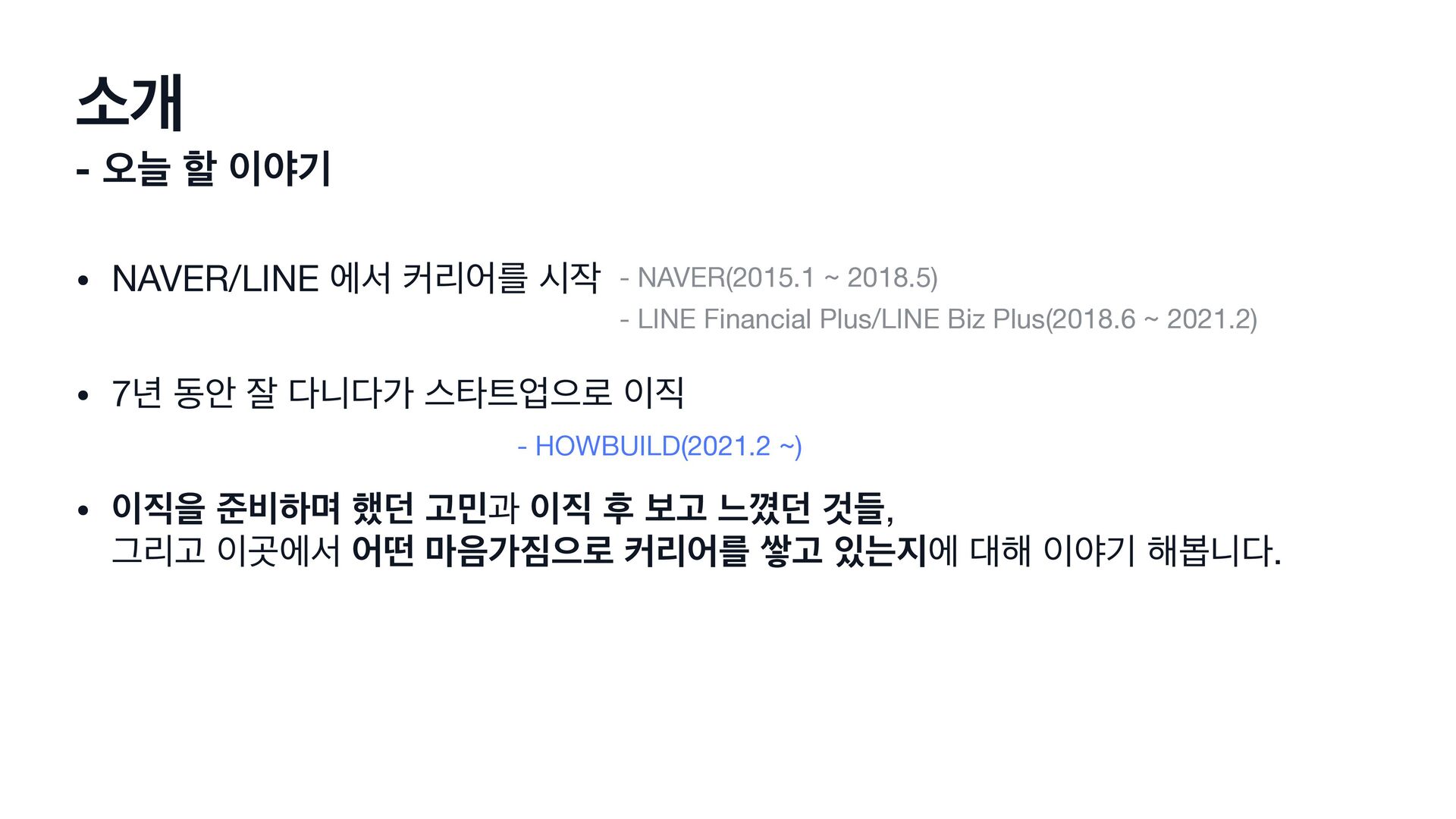 • 7֙ زউ ੜ פо झఋসਵ۽ • ਸ ળ࠺ೞݴ ೮؍ Ҋҗ റ ࠁҊ וԕ؍ Ѫٜ, ӒܻҊ Ҕীࢲ যڃ ݃оਵ۽ ழܻযܳ ऺҊ חী ೧ ঠӝ ೧ࠇפ. - NAVER(2015.1 ~ 2018.5) - LINE Financial Plus/LINE Biz Plus(2018.6 ~ 2021.2) - HOWBUILD(2021.2 ~)
