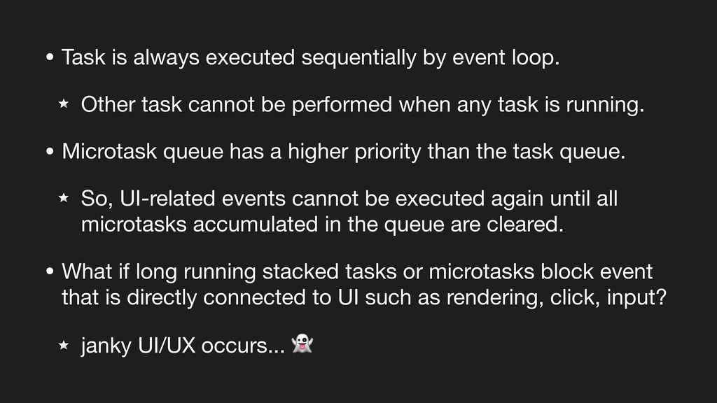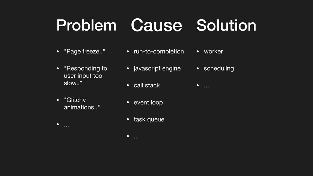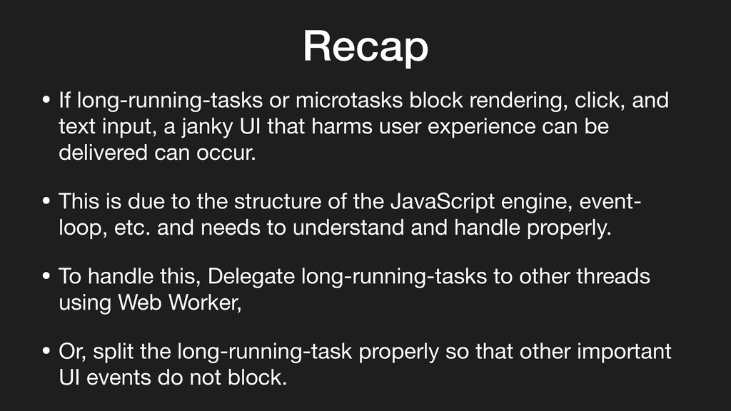 Page freeze, glitchy animation, and slow scrolling. They follow us everywhere, and we'd like them to stop. This talk will get to the bottom of these issues by delving into the Javascript engine and concepts like task, call-stack, and event-loops. I will also introduce several ways to tackle these problems and walk you through a demo to help you understand.
