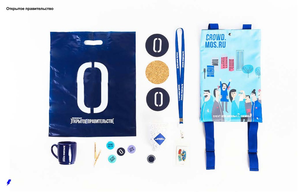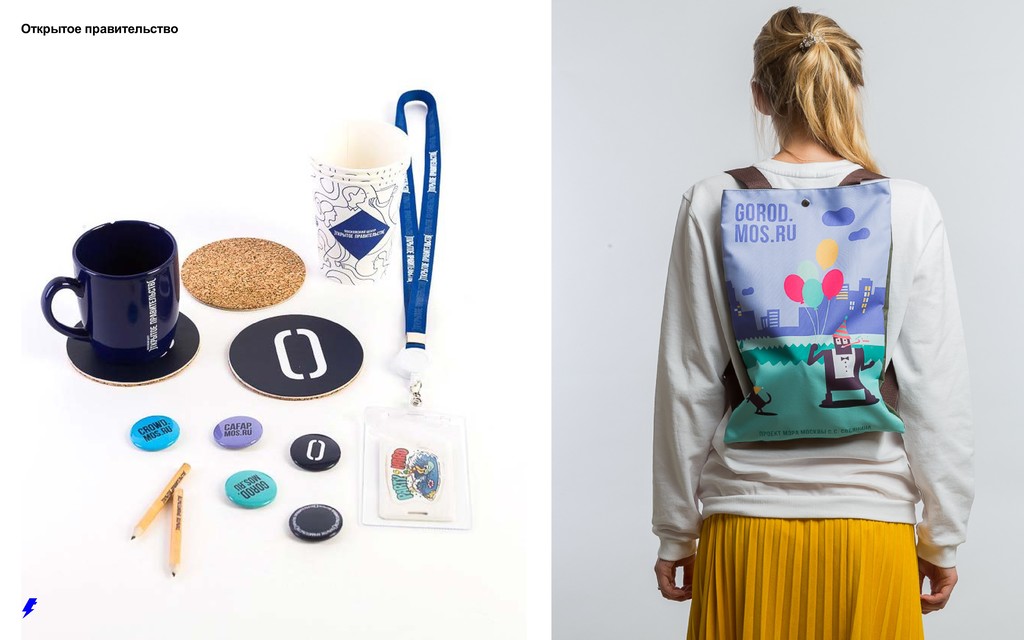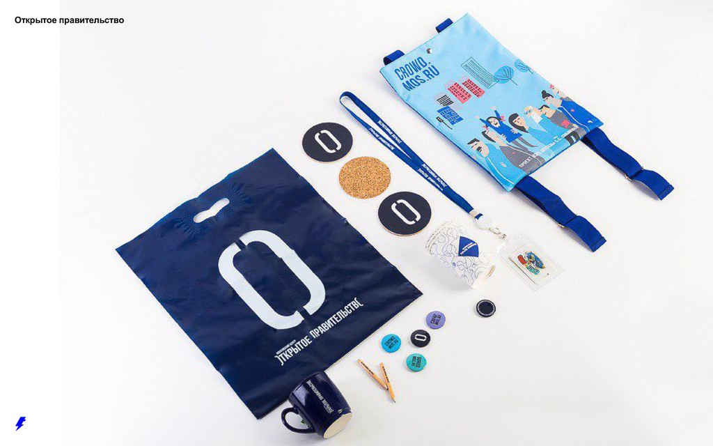раздаточной сувенирной продукции. Решение Мы разработали линейку продукции и адаптировали готовый дизайн под печатный формат. Предметы должны были отражать философию “Открытого правительства”, как понятной и близкой гражданам государственной системы. Поэтому мы выбрали полезные и простые вещи, доступные каждому: кружки и подстаканники, пакеты и рюкзаки, значки, карандаши и держатели для телефонов. Яркий дизайн привлекает внимание, одновременно информируя аудиторию об общественных проектах по улучшению жизни города, которые реализует «Открытое Правительство».