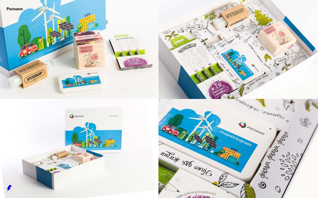 одной из главных технологических компаний России. Решение За 10 лет компания вырастила 6 технологических кластеров, и планирует развить еще 5. Поэтому подарок должен был полностью отражать инновационность и направленность «Роснано» на бережное отношение к окружающему миру и постоянное развитие. В подарочный набор вошли: - экологичная нанокосметика для обуви, - брендированный power bank, - набор для выращивания растений и трав! Дизайн-концепция обыгрывает эко-тематику и фирменный стиль Группы «Роснано».
