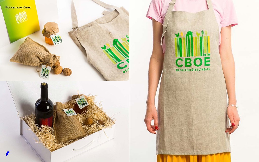 фермерской еды «СВОЕ», организованного АО «Россельхозбанк». Решение Фестиваль направлен на укрепление сотрудничества между банком и региональными хозяйствами и знакомство населения с натуральной фермерской продукцией. Поэтому в состав подарка мы включили экологичные продукты: вино, мёд, грецкие орехи в холщовом мешочке и брендированный фартук. Концепция подарков объединяет фирменный стиль Заказчика и сферу агробизнеса, в поддержку которого и организован фестиваль.