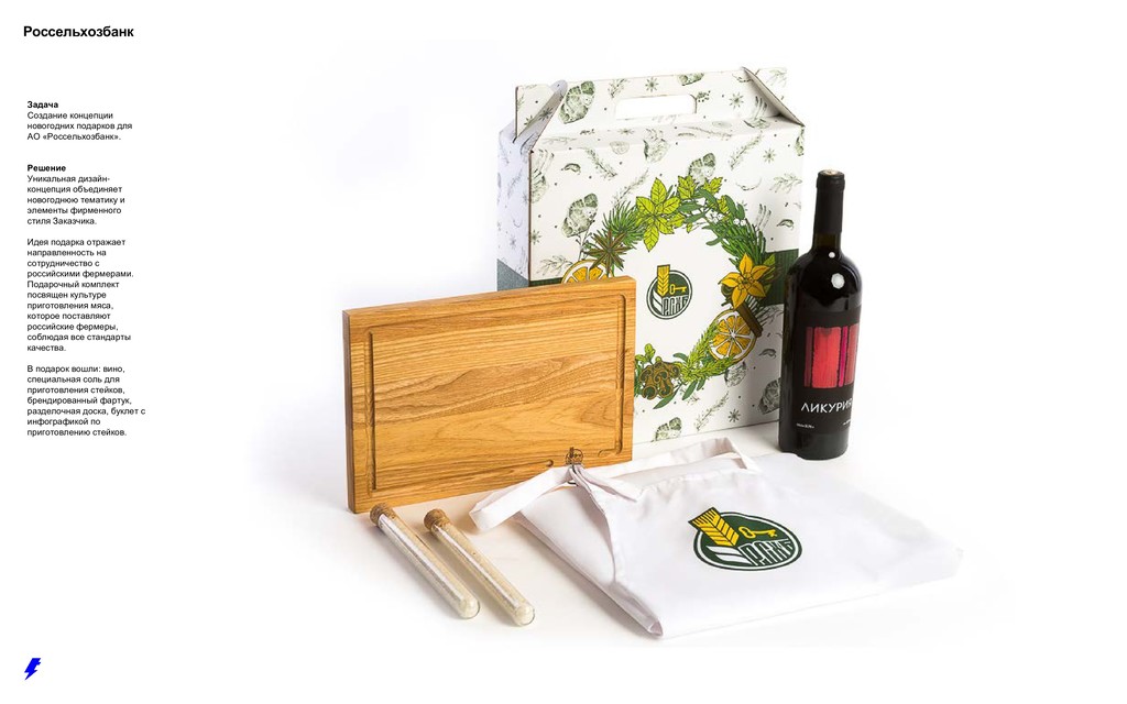 Уникальная дизайн- концепция объединяет новогоднюю тематику и элементы фирменного стиля Заказчика. Идея подарка отражает направленность на сотрудничество с российскими фермерами. Подарочный комплект посвящен культуре приготовления мяса, которое поставляют российские фермеры, соблюдая все стандарты качества. В подарок вошли: вино, специальная соль для приготовления стейков, брендированный фартук, разделочная доска, буклет с инфографикой по приготовлению стейков.