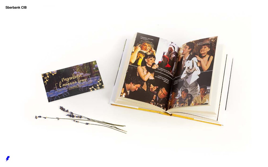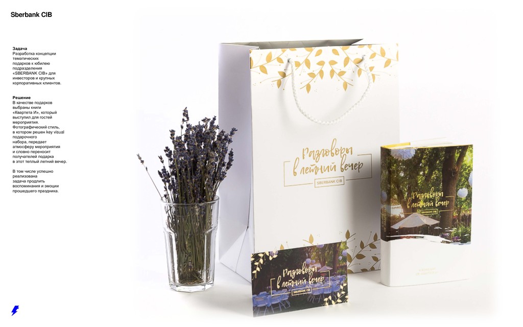 «SBERBANK CIB» для инвесторов и крупных корпоративных клиентов. Решение В качестве подарков выбраны книги «Квартета И», который выступил для гостей мероприятия. Фотографический стиль, в котором решен key visual подарочного набора, передает атмосферу мероприятия и словно переносит получателей подарка в этот теплый летний вечер. В том числе успешно реализована задача продлить воспоминания и эмоции прошедшего праздника.