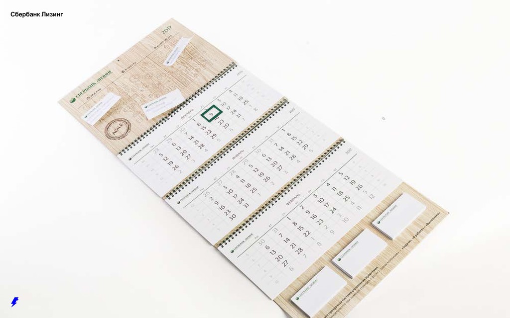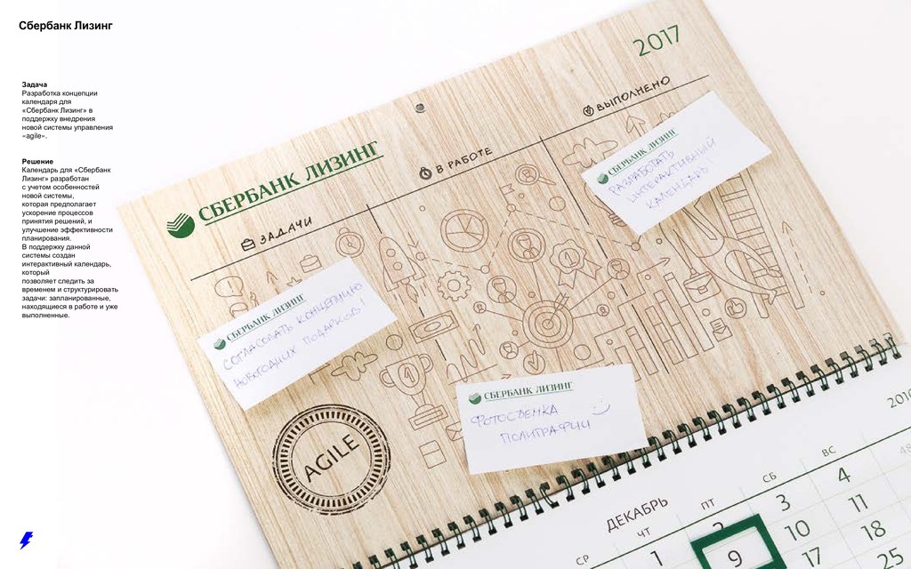 поддержку внедрения новой системы управления «agile». Решение Календарь для «Сбербанк Лизинг» разработан с учетом особенностей новой системы, которая предполагает ускорение процессов принятия решений, и улучшение эффективности планирования. В поддержку данной системы создан интерактивный календарь, который позволяет следить за временем и структурировать задачи: запланированные, находящиеся в работе и уже выполненные.