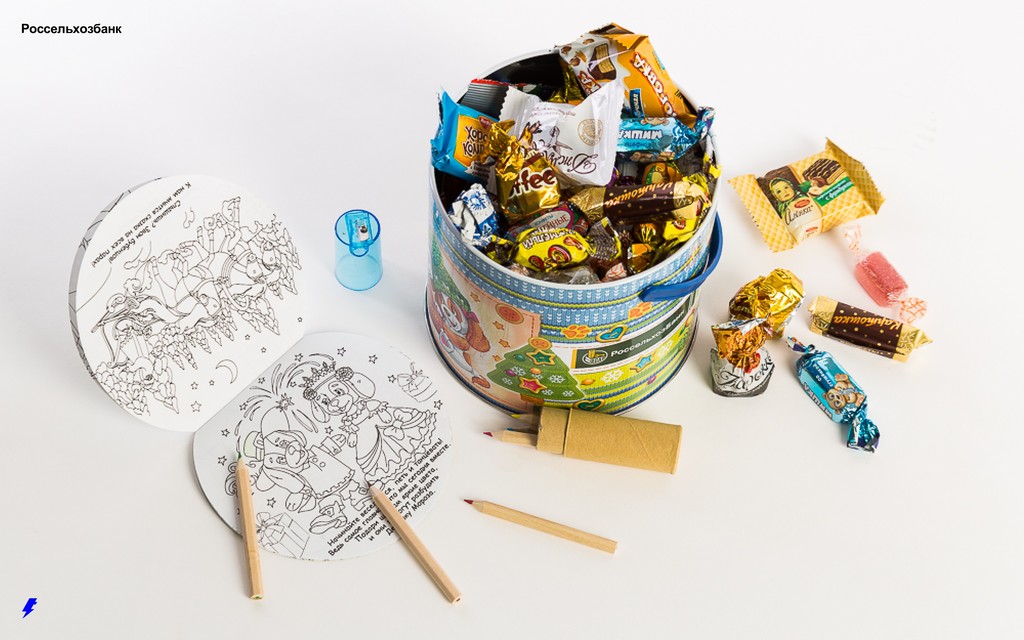«Россельхозбанк» Решение В состав подарка вошли: сладости в специальной жестяной упаковке, удобной для транспортировки по регионам России, авторская раскраска с символом года – собаками и специальный набор карандашей. Дизайн-концепция подарка объединяет фирменный стиль Заказчика и новогоднюю тематику.