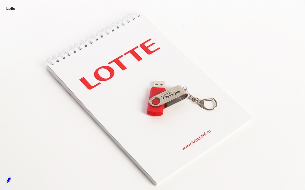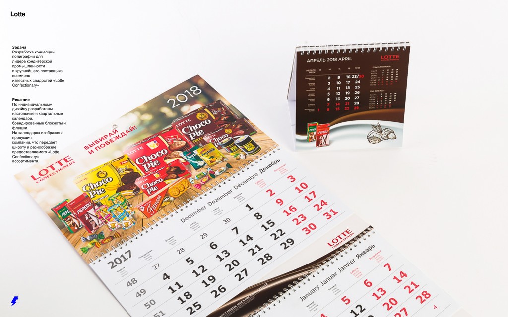 крупнейшего поставщика всемирно известных сладостей «Lotte Confectionary» Решение По индивидуальному дизайну разработаны настольные и квартальные календари, брендированные блокноты и флешки. На календарях изображена продукция компании, что передает широту и разнообразие предоставляемого «Lotte Confectionary» ассортимента.
