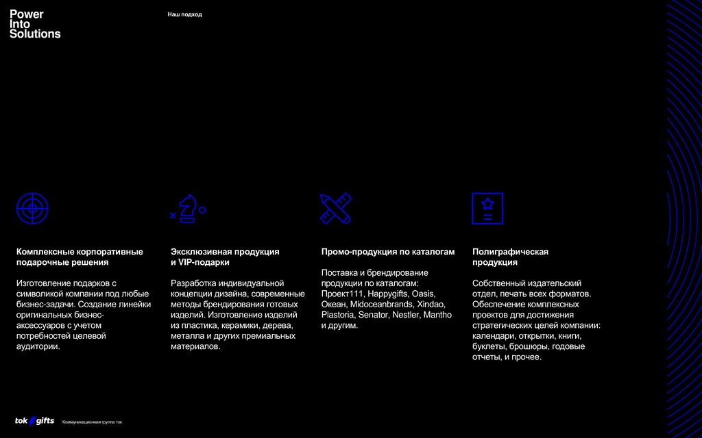 любые бизнес-задачи. Создание линейки оригинальных бизнес- аксессуаров с учетом потребностей целевой аудитории. Эксклюзивная продукция и VIP-подарки Разработка индивидуальной концепции дизайна, современные методы брендирования готовых изделий. Изготовление изделий из пластика, керамики, дерева, металла и других премиальных материалов. Промо-продукция по каталогам Поставка и брендирование продукции по каталогам: Проект111, Happygifts, Oasis, Океан, Midoceanbrands, Xindao, Plastoria, Senator, Nestler, Mantho и другим. Полиграфическая продукция Собственный издательский отдел, печать всех форматов. Обеспечение комплексных проектов для достижения стратегических целей компании: календари, открытки, книги, буклеты, брошюры, годовые отчеты, и прочее. Наш подход Power Into Solutions Коммуникационная группа ток