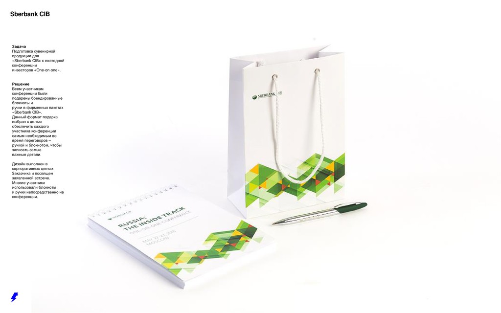 ежегодной конференции инвесторов «One-on-one». Решение Всем участникам конференции были подарены брендированные блокноты и ручки в фирменных пакетах «Sberbank CIB». Данный формат подарка выбран с целью обеспечить каждого участника конференции самым необходимым во время переговоров – ручкой и блокнотом, чтобы записать самые важные детали. Дизайн выполнен в корпоративных цветах Заказчика и посвящен заявленной встрече. Многие участники использовали блокноты и ручки непосредственно на конференции.