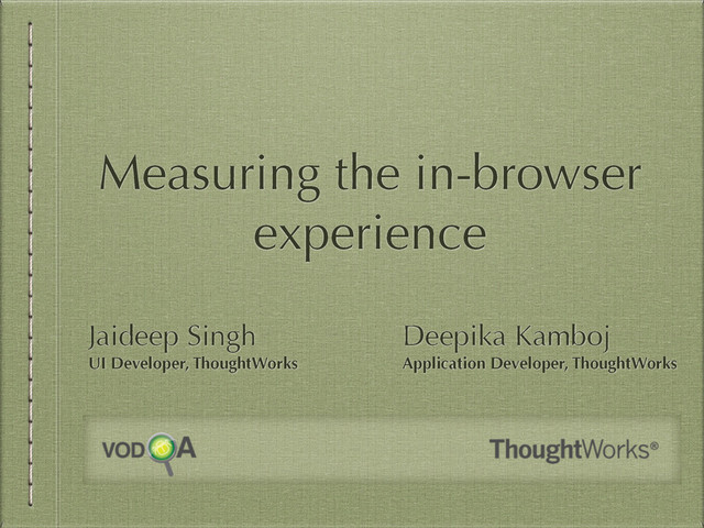 This was presented at vodQA, Gurgaon. Touching on the various aspects which affect the performance of single page applications within the browser. Specifically the factors like network latency and asset load times, too many requests, file sizes, event listener count, Javascript memory heap size, performance improvement and optimizations.