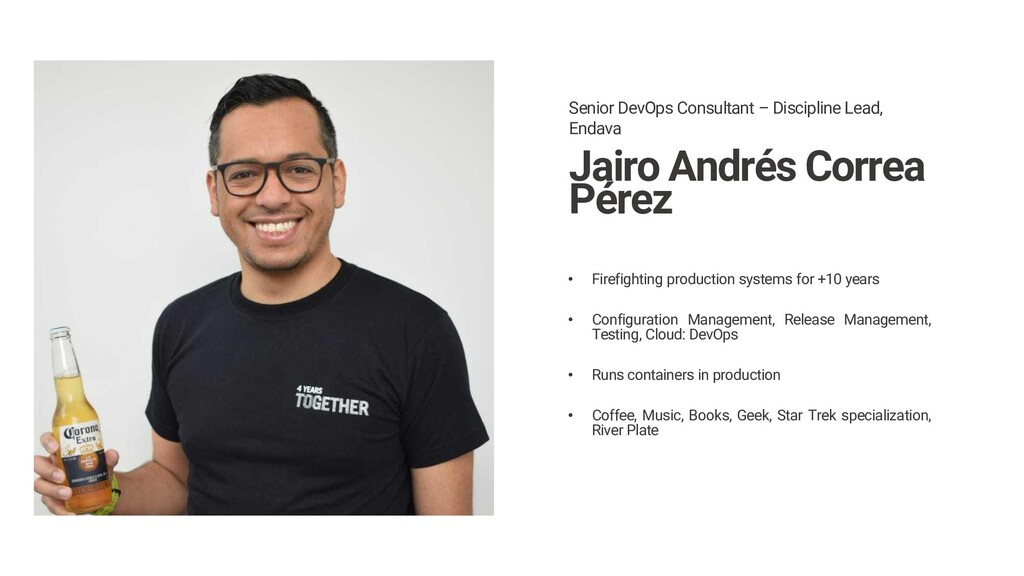 years • Configuration Management, Release Management, Testing, Cloud: DevOps • Runs containers in production • Coffee, Music, Books, Geek, Star Trek specialization, River Plate Senior DevOps Consultant – Discipline Lead, Endava