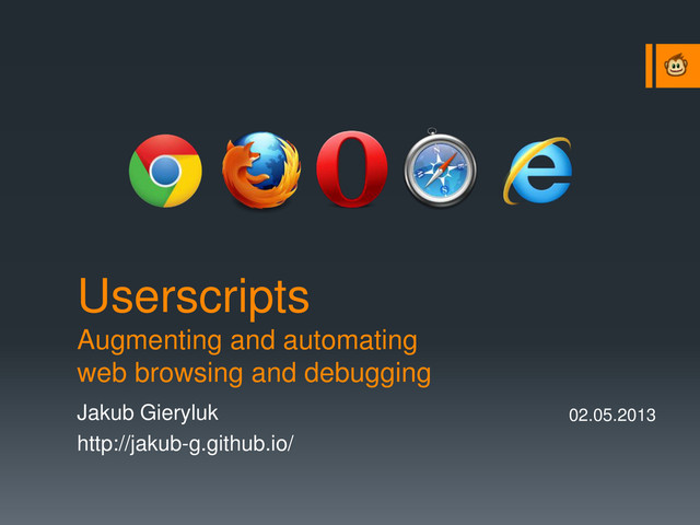 means that the page is using just plain JS. then window in userscript === window in the page scope If we want to use some special GM_* functions, we have to explicitly @grant the permission for the script to use it (since GM 1.0), one-by-one. Otherwise, those identifiers will be undefined. // ==UserScript== // ... // @grant GM_setValue // @grant GM_getValue // ==/UserScript== If we @grant’ed anything, then window in userscript !== window in the page scope window in userscript is a „safe window”, to separate the privileged and non- privileged execution scope Like a newly created window object, without any alterations or user-defined global variables This is to prevent the access to GM_* functions by the malicious script on a page unsafeWindow in userscript === window in the page scope