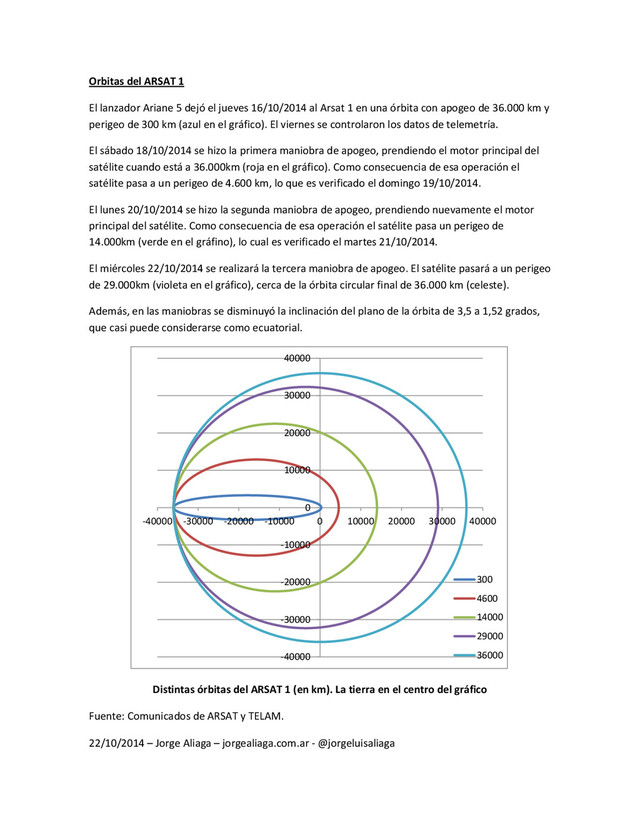 jueves 16/10/2014 al Arsat 1 en una órbita con apogeo de 36.000 km y perigeo de 300 km (azul en el gráfico). El viernes se controlaron los datos de telemetría. El sábado 18/10/2014 se hizo la primera maniobra de apogeo, prendiendo el motor principal del satélite cuando está a 36.000km (roja en el gráfico). Como consecuencia de esa operación el satélite pasa a un perigeo de 4.600 km, lo que es verificado el domingo 19/10/2014. El lunes 20/10/2014 se hizo la segunda maniobra de apogeo, prendiendo nuevamente el motor principal del satélite. Como consecuencia de esa operación el satélite pasa un perigeo de 14.000km (verde en el gráfino), lo cual es verificado el martes 21/10/2014. El miércoles 22/10/2014 se realizará la tercera maniobra de apogeo. El satélite pasará a un perigeo de 29.000km (violeta en el gráfico), cerca de la órbita circular final de 36.000 km (celeste). Además, en las maniobras se disminuyó la inclinación del plano de la órbita de 3,5 a 1,52 grados, que casi puede considerarse como ecuatorial. Distintas órbitas del ARSAT 1 (en km). La tierra en el centro del gráfico Fuente: Comunicados de ARSAT y TELAM. 22/10/2014 – Jorge Aliaga – jorgealiaga.com.ar - @jorgeluisaliaga -40000 -30000 -20000 -10000 0 10000 20000 30000 40000 -40000 -30000 -20000 -10000 0 10000 20000 30000 40000 300 4600 14000 29000 36000