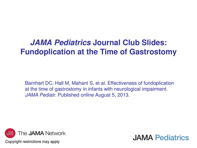 cohort. • Data Set: Pediatric Health Information System administrative database (42 not-for-profit, freestanding children’s hospitals), with 4 inclusion criteria: – (1) Birth date in 2005 to 2010. – (2) Admission to neonatal intensive care unit within first 90 days of life. – (3) International Classification of Diseases, Ninth Revision, Clinical Modification diagnostic code for neurological impairment (eg, cerebral palsy, hydrocephalus, leukodystrophy, epilepsy). – (4) Procedural code for GT placement during the initial neonatal intensive care unit admission. • Follow-Up: For 1 year after GT placement. Participants – 2759 Children underwent GT placement only. – 1404 Children underwent GT placement with concomitant fundoplication. Methods