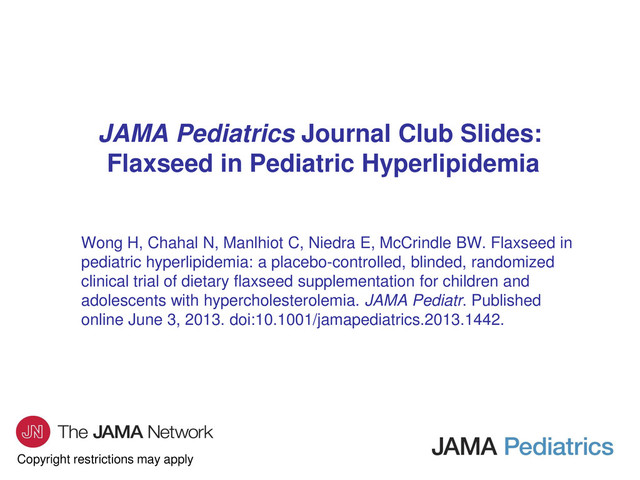 in Pediatric Hyperlipidemia Wong H, Chahal N, Manlhiot C, Niedra E, McCrindle BW. Flaxseed in pediatric hyperlipidemia: a placebo-controlled, blinded, randomized clinical trial of dietary flaxseed supplementation for children and adolescents with hypercholesterolemia. JAMA Pediatr. Published online June 3, 2013. doi:10.1001/jamapediatrics.2013.1442.