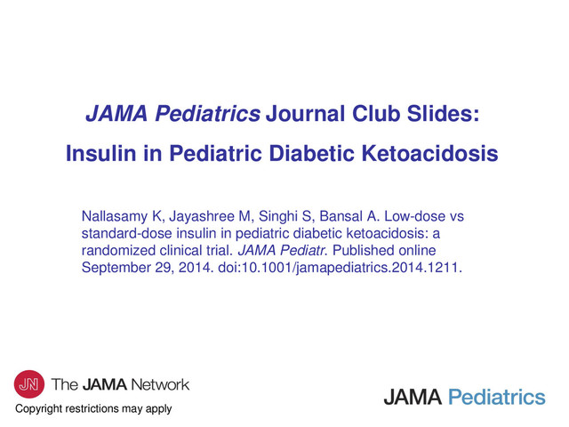 Characteristic Low-Dose Group (n = 25) Standard-Dose Group (n = 25) Age, mean (SD), y 7.3 (3.8) 6.5 (3.6) Male/female, No. 9/16 11/14 Children with malnutrition, No. (%) 7 (28) 8 (32) New-onset DKA, No. (%) 13 (52) 16 (64) BG, mean (SD), mg/dL 485.3 (133) 524.4 (103) pH, mean (SD) 7.08 (0.12) 7.05 (0.11) Bicarbonate, mean (SD), mEq/L 6.2 (2.6) 7.0 (3.1) Sodium, mean (SD), mEq/L 133.0 (7.0) 134.5 (10.0) Potassium, mean (SD), mEq/L 4.8 (0.8) 4.7 (0.7) Effective osmolality, mean (SD), mOsm/kg 292.0 (13.8) 298.2 (21.2)