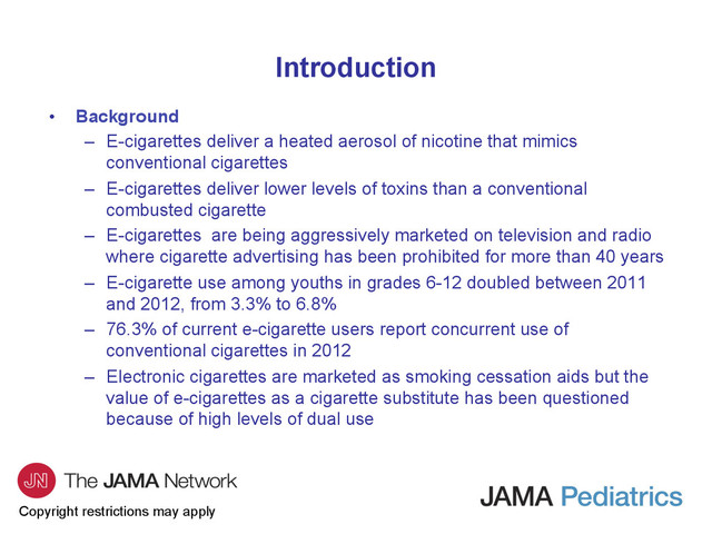 heated aerosol of nicotine that mimics conventional cigarettes – E-cigarettes deliver lower levels of toxins than a conventional combusted cigarette – E-cigarettes are being aggressively marketed on television and radio where cigarette advertising has been prohibited for more than 40 years – E-cigarette use among youths in grades 6-12 doubled between 2011 and 2012, from 3.3% to 6.8% – 76.3% of current e-cigarette users report concurrent use of conventional cigarettes in 2012 – Electronic cigarettes are marketed as smoking cessation aids but the value of e-cigarettes as a cigarette substitute has been questioned because of high levels of dual use Introduction