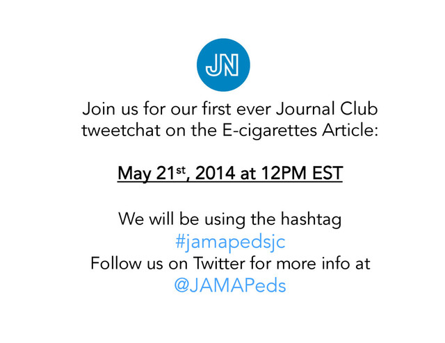 We are having our first tweetchat on May 21st 2014 at 12PM EST in conjunction w/ University of Michigan residency program! Join us! Hashtag will be #jamapedsjc We will discuss the recent e-cigarettes article http://jama.md/1lLHQx6
