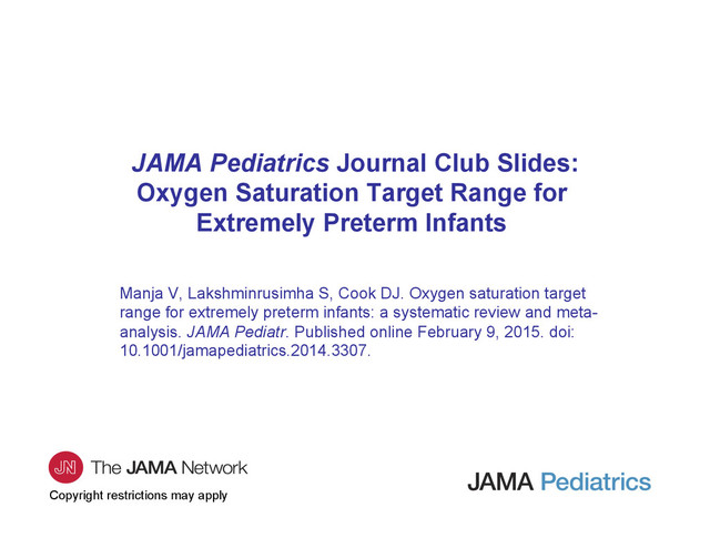 oxygen saturation (SpO2 ) target for extremely preterm infants has been the focus of 5 randomized clinical trials (Surfactant, Positive Pressure, and Oxygenation Randomized Trial [SUPPORT], Benefits of Oxygen Saturation Targeting II [BOOST II] in the United Kingdom, Australia, and New Zealand, and Canadian Oxygen Trial [COT]). • Study Objective – To assess whether targeting a lower SpO2 range (85%-89% restricted oxygen) has an effect on mortality and severe disability, mortality alone, bronchopulmonary dysplasia, neurodevelopmental outcome, hearing loss, necrotizing enterocolitis, or severe retinopathy of prematurity compared with targeting a higher SpO2 range (91%-95% liberal oxygen) after accounting for the risk of bias of each included study as well as the quality of evidence for each outcome. • Study Design – Meta-analysis and systematic review. Introduction
