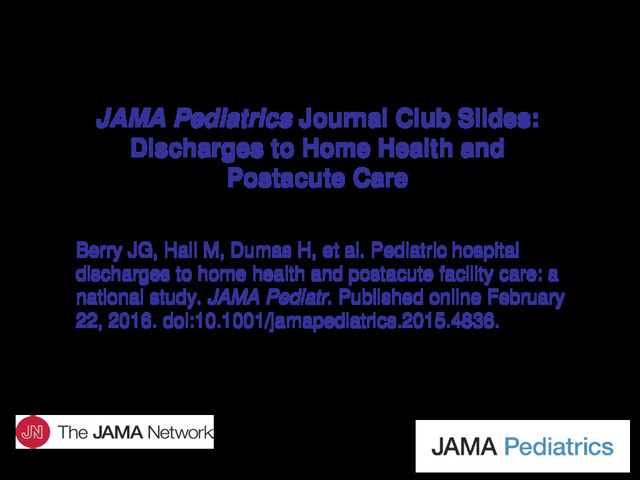 to Home Health and Postacute Care Berry JG, Hall M, Dumas H, et al. Pediatric hospital discharges to home health and postacute facility care: a national study. JAMA Pediatr. Published online February 22, 2016. doi:10.1001/jamapediatrics.2015.4836.