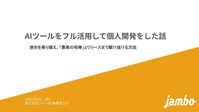 AIツールをフル活⽤して個⼈開発をした話 挫折を乗り越え、「最高の相棒」とリリースまで駆け抜ける方法 2026/01/12(⽉) 株式会社ジャンボ ⾼橋淳之介
