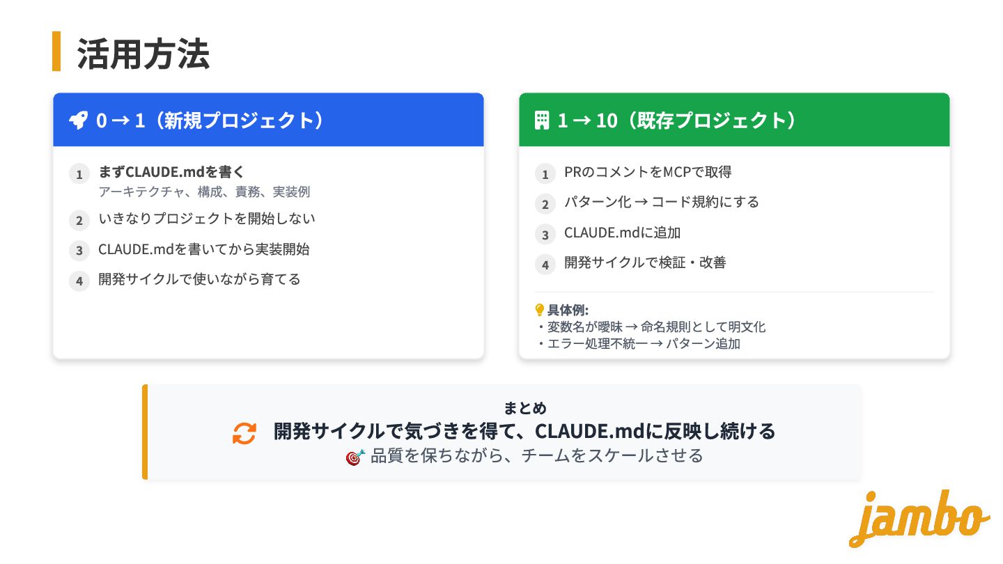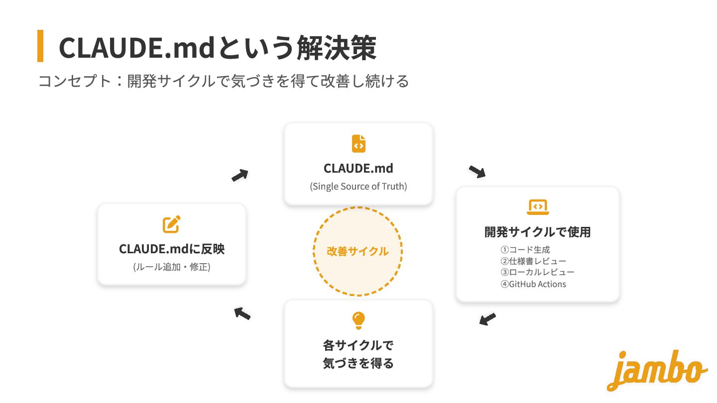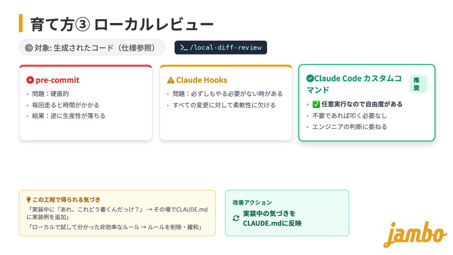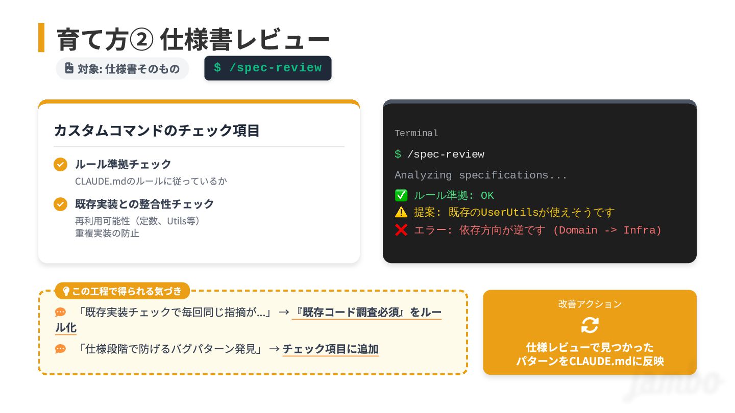 「既存実装チェックで毎回同じ指摘が...」 → 『既存コード調査必須』をルー ル化 「仕様段階で防げるバグパターン発見」 → チェック項目に追加 この工程で得られる気づき 改善アクション カスタムコマンドのチェック項目 ルール準拠チェック CLAUDE.mdのルールに従っているか 既存実装との整合性チェック 再利用可能性(定数、Utils等) 重複実装の防止 $ /spec-review Analyzing specifications... ✅ ルール準拠: OK ⚠️ 提案: 既存のUserUtilsが使えそうです ❌ エラー: 依存方向が逆です (Domain -> Infra) Terminal