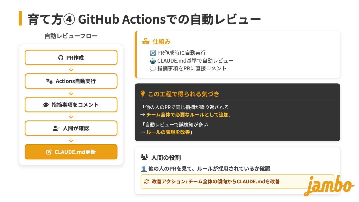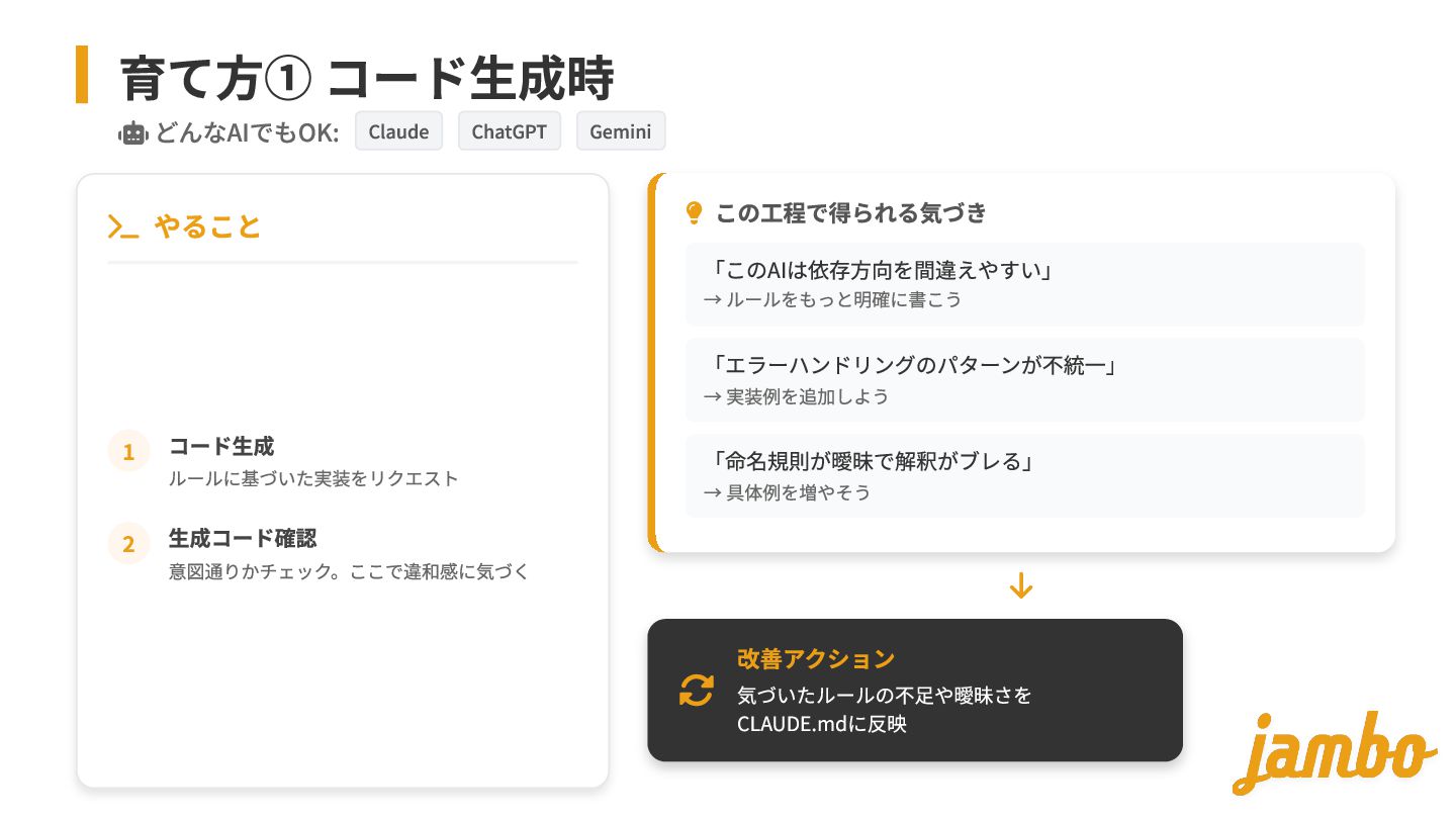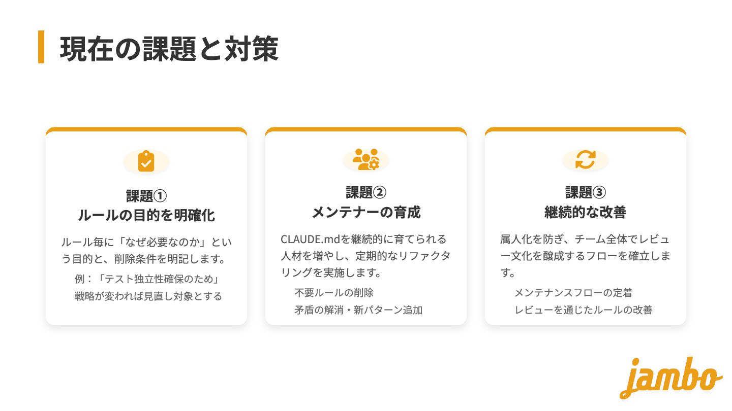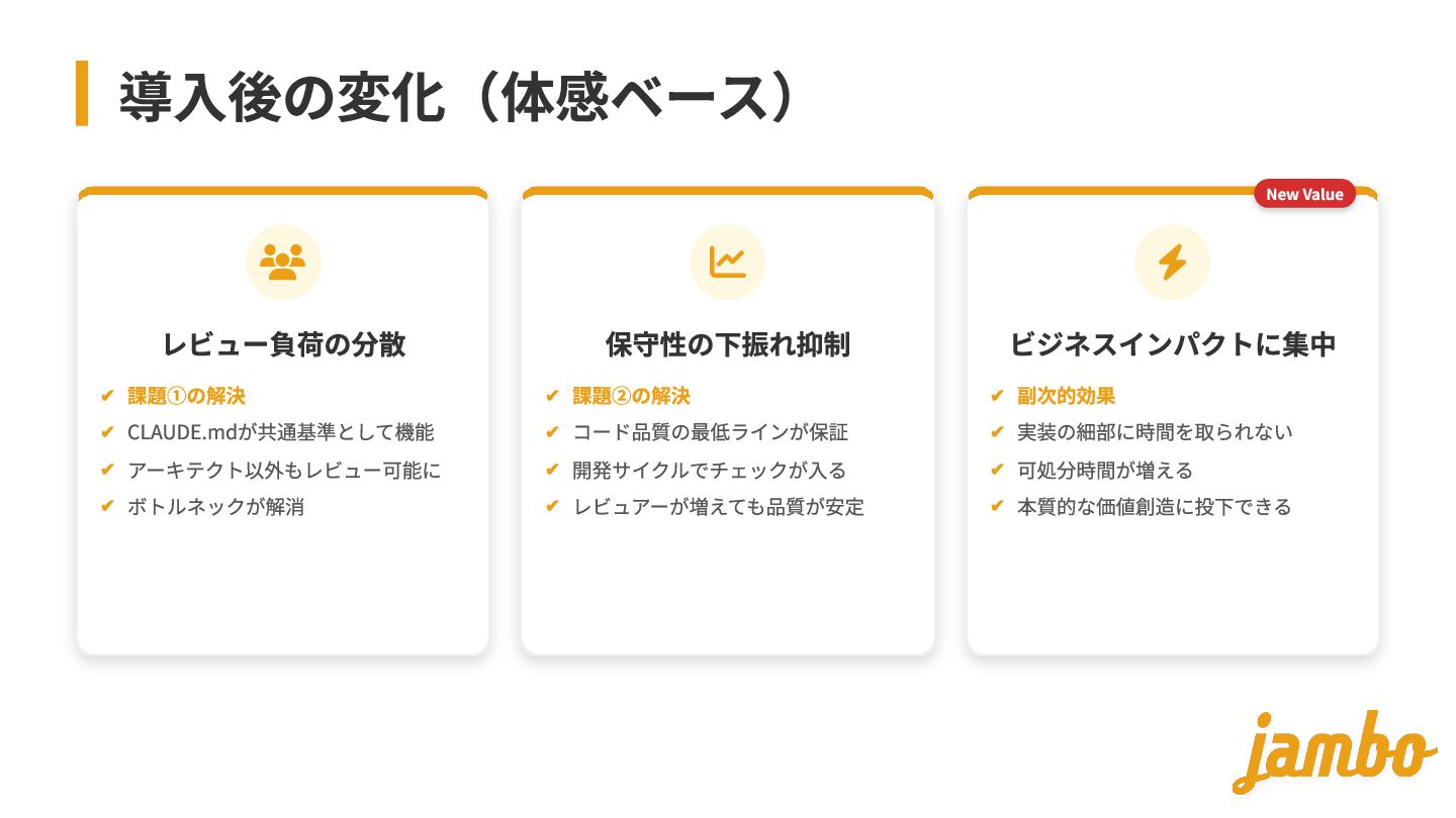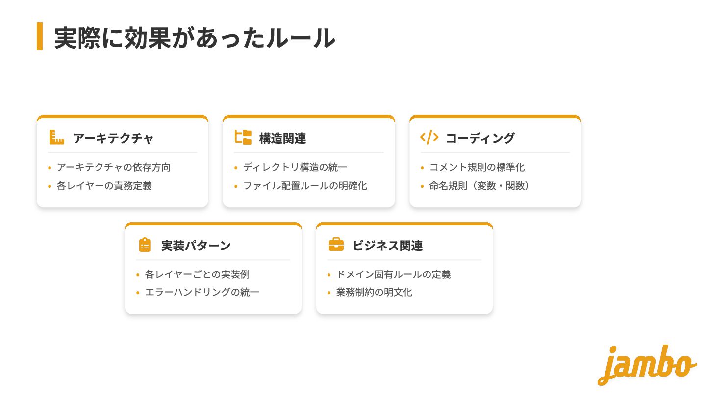 「既存実装チェックで毎回同じ指摘が...」 → 『既存コード調査必須』をルー ル化 「仕様段階で防げるバグパターン発見」 → チェック項目に追加 この工程で得られる気づき 改善アクション カスタムコマンドのチェック項目 ルール準拠チェック CLAUDE.mdのルールに従っているか 既存実装との整合性チェック 再利用可能性(定数、Utils等) 重複実装の防止 $ /spec-review Analyzing specifications... ✅ ルール準拠: OK ⚠️ 提案: 既存のUserUtilsが使えそうです ❌ エラー: 依存方向が逆です (Domain -> Infra) Terminal
