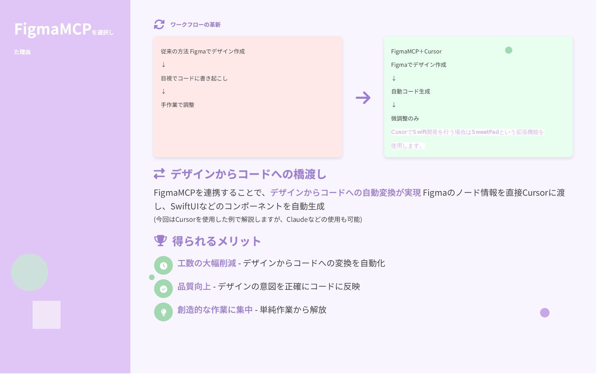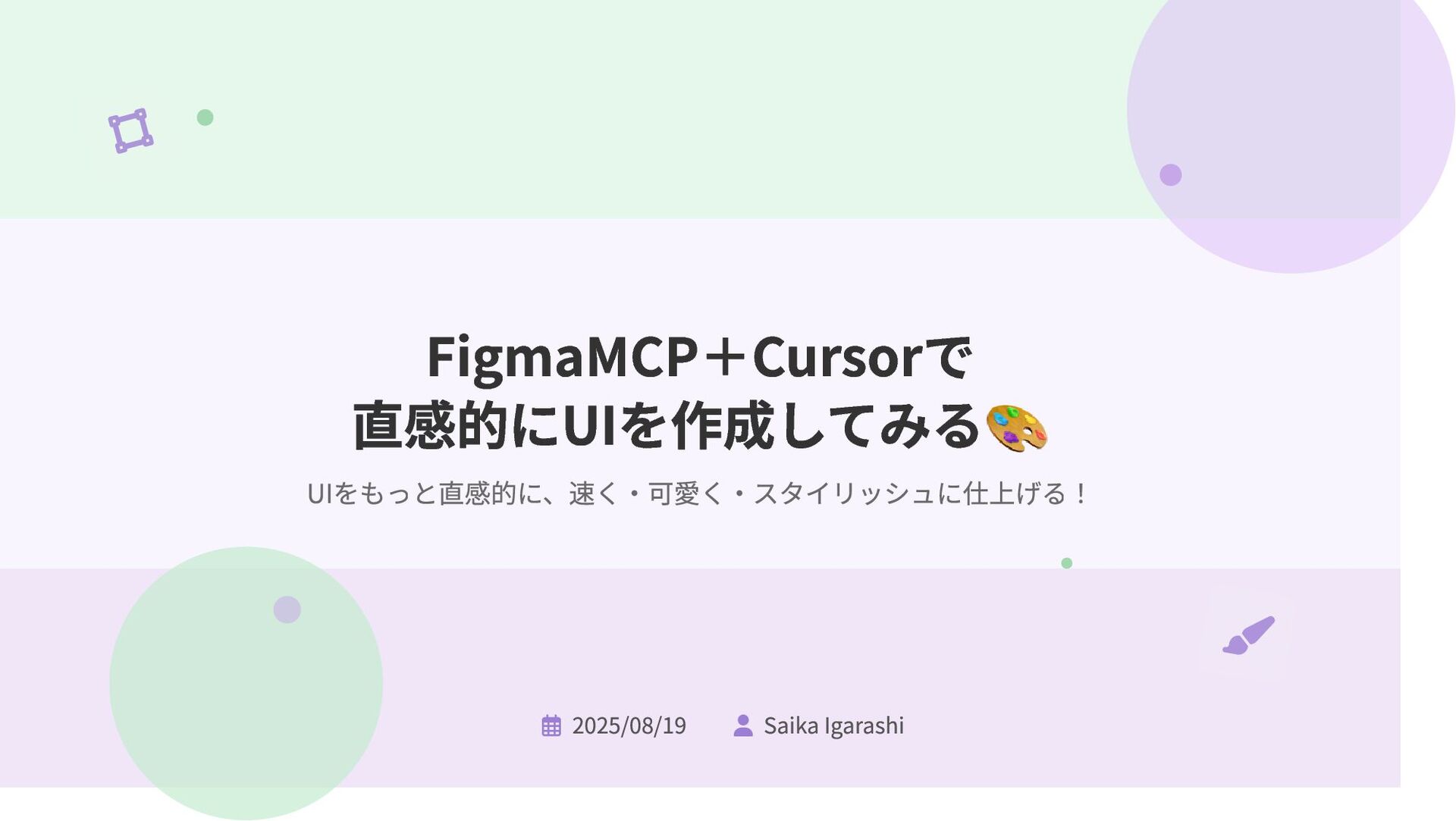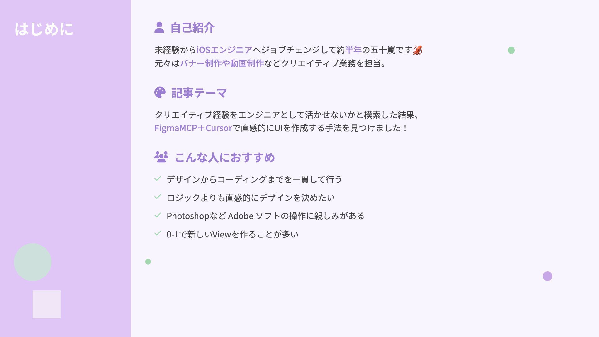 元々はバナー制作や動画制作などクリエイティブ業務を主に担当していたため、それらの経験をエンジニアとして活かせないかと模索した結果、今回のFigmaMCP+Cursorで直感的にUIを作成してみる🎨に辿り着きました!