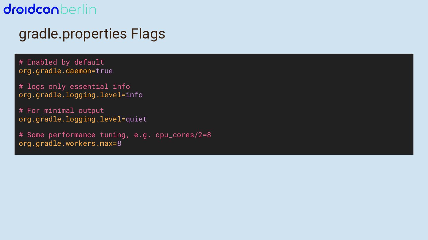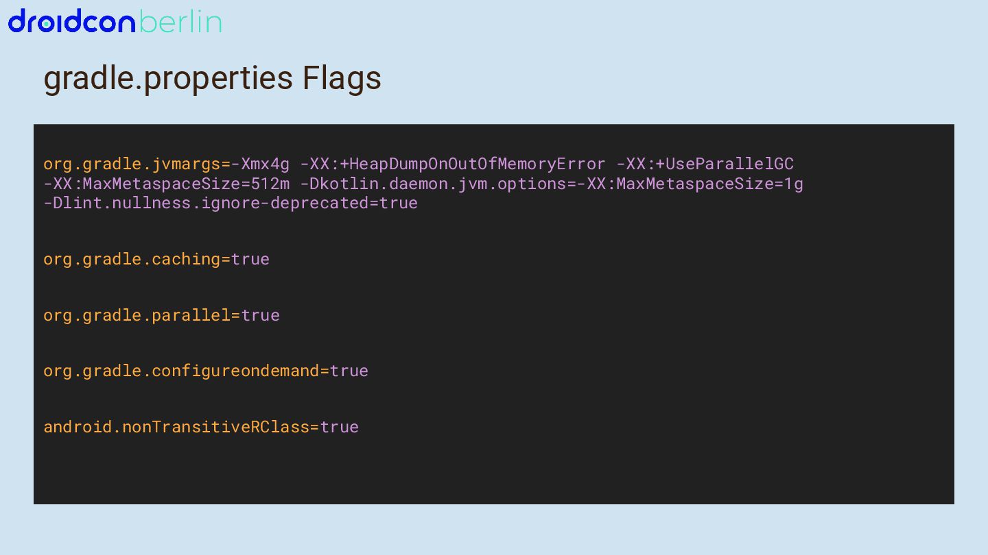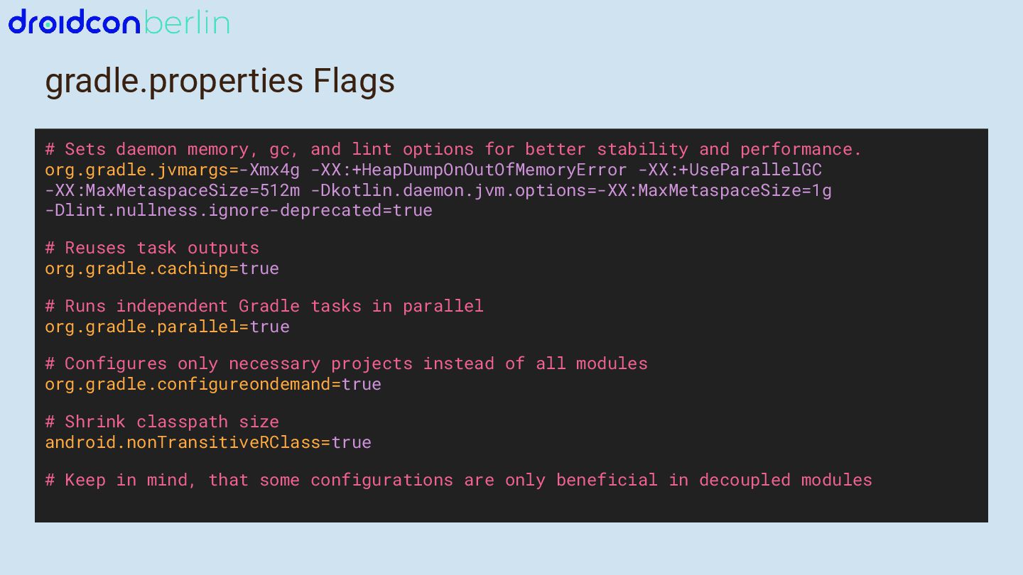 - Which gradle.properties settings directly impact build performance and why.
