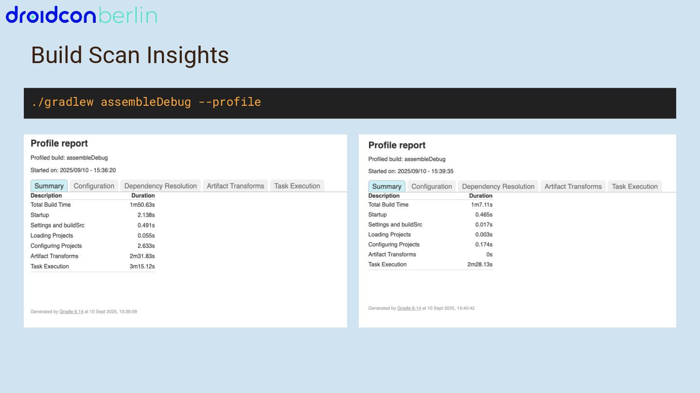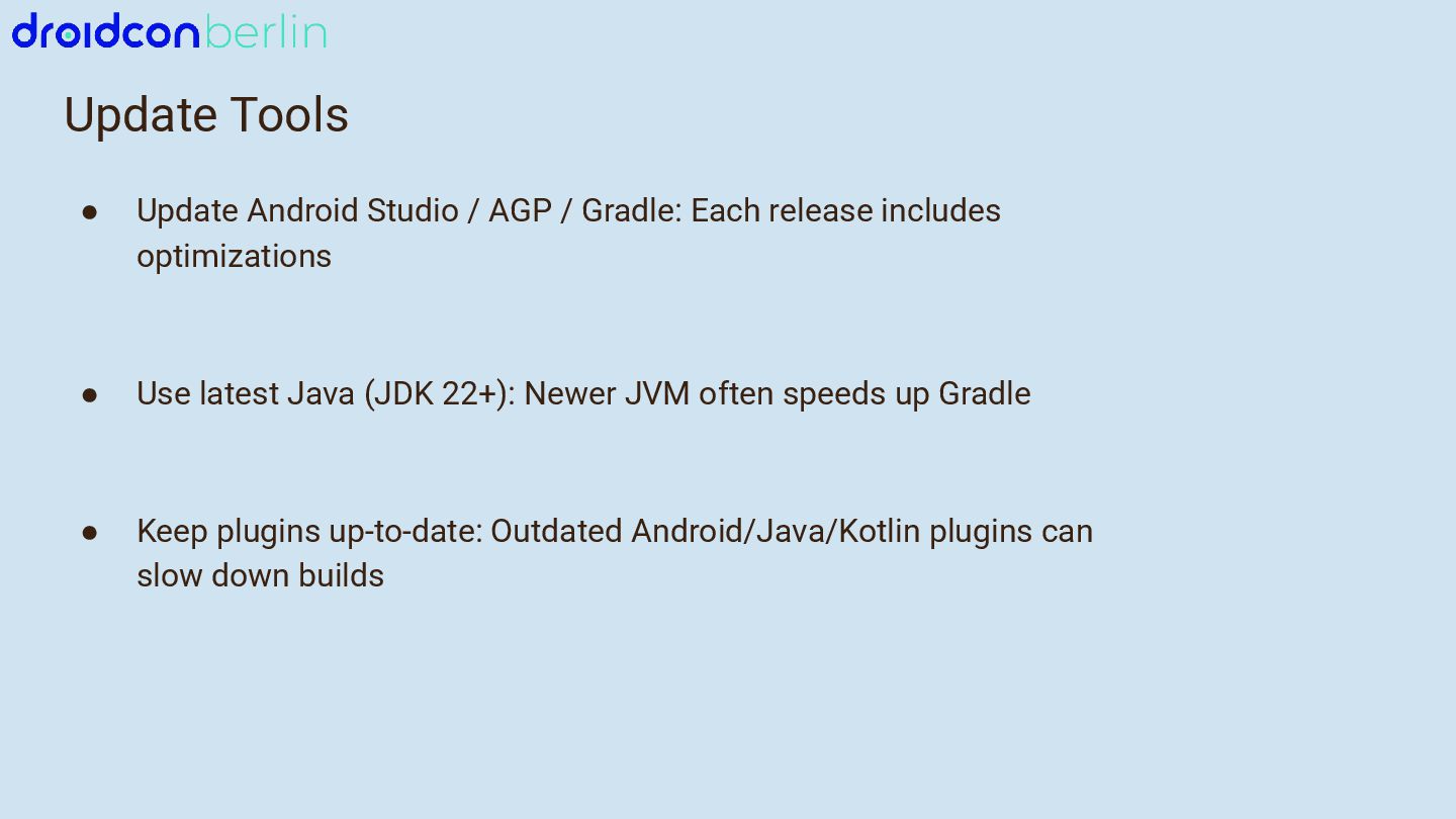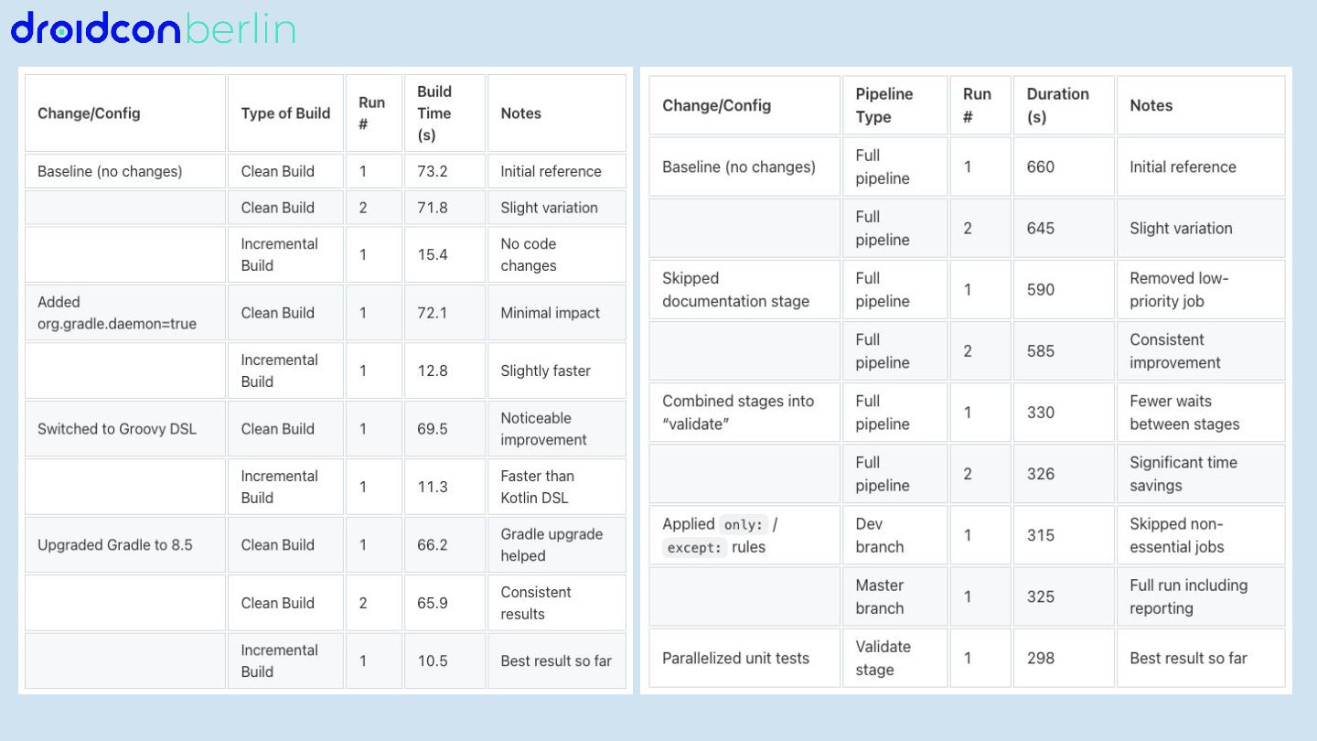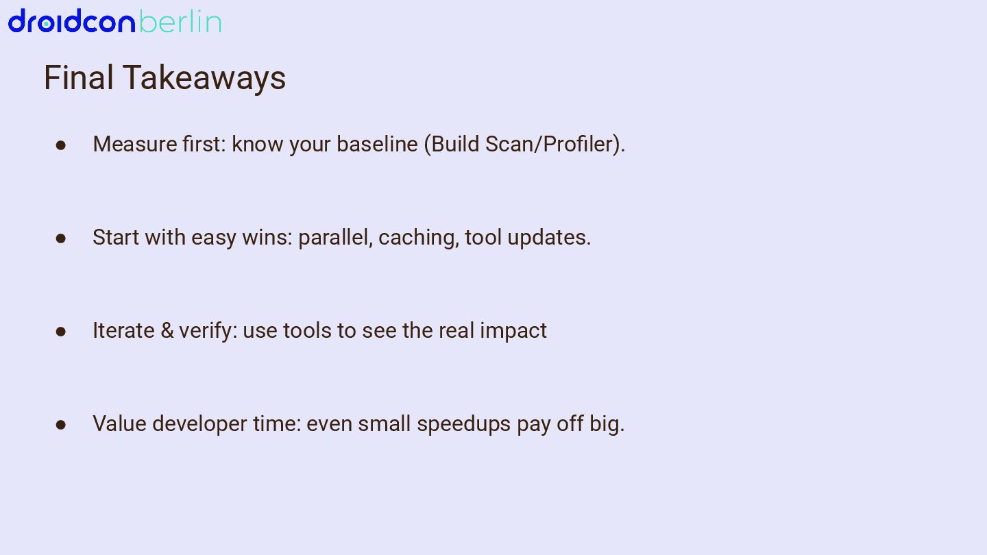 We’ll start with Gradle: I’ll break down which gradle.properties changes actually moved the needle, how updating to newer Java and Kotlin versions improved performance, and how a comparison between Groovy and Kotlin DSL surfaced potential future wins. You’ll get a practical look at what worked, what didn’t, and how to measure impact in your own project.