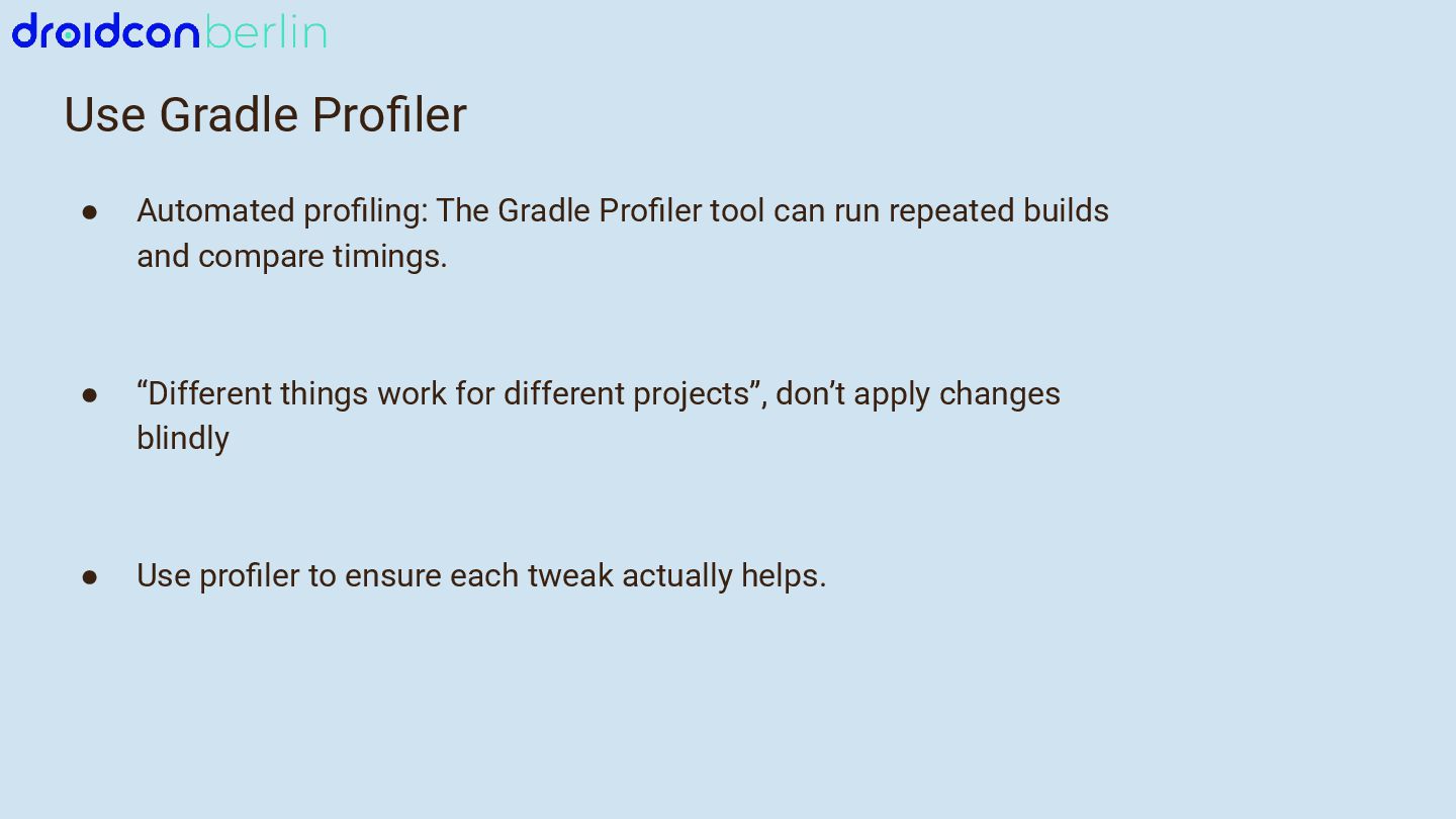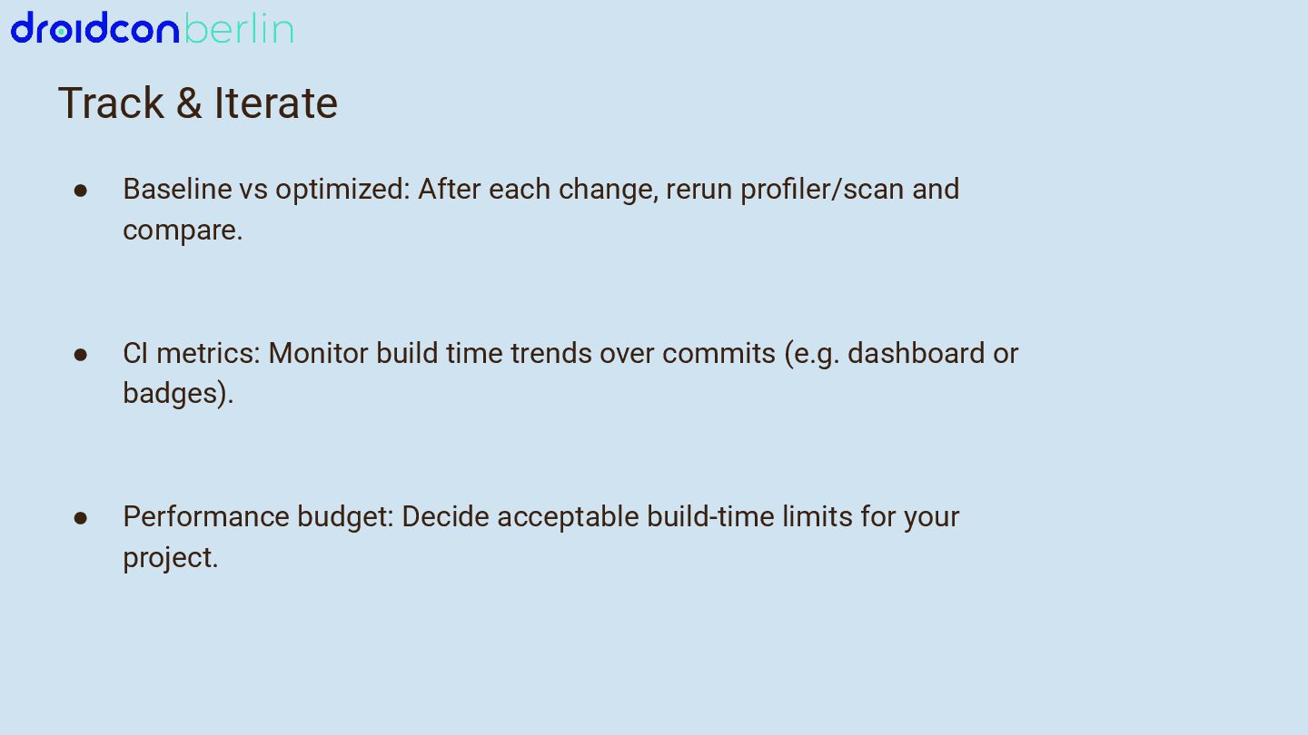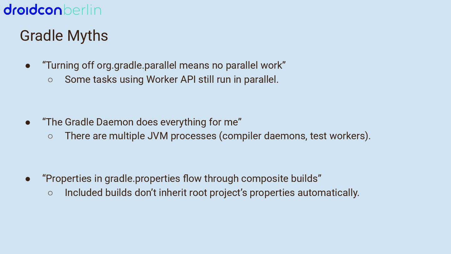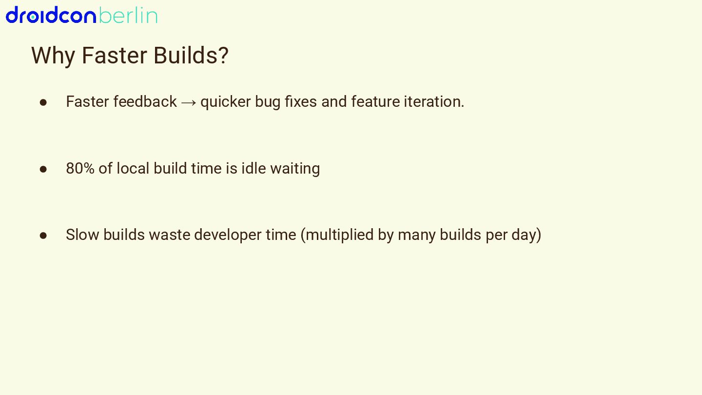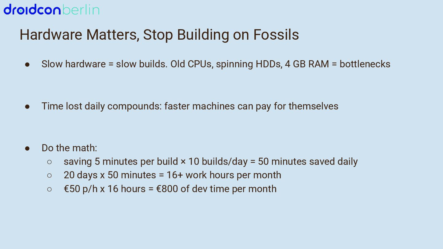 We’ll start with Gradle: I’ll break down which gradle.properties changes actually moved the needle, how updating to newer Java and Kotlin versions improved performance, and how a comparison between Groovy and Kotlin DSL surfaced potential future wins. You’ll get a practical look at what worked, what didn’t, and how to measure impact in your own project.