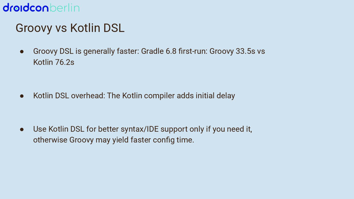 - A comparison of Kotlin vs Groovy DSL for build scripts — and how Groovy may still offer speed advantages in some cases.