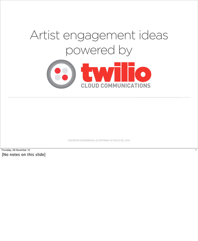 November 12 Incentivise fans to sign up for services or make purchases to receive a call from their favorite artist. There are different ways to achieve this using Twilio. For example: 1. The artist pre-records a phone call and Twilio can be used to place an automated outbound call to the fan base at a pre determined time and date e.g. Christmas Day, fan Birthday. This call could be a personalised message, general update from the artist or include previews of new releases, etc. 2. The artist could place a live outbound call to interact directly with fans for additional wow factor. Using Twilio this call can be made anonymously so no caller ID is passed to the fan. 3. Create on the fly conference calls to bring multiple fans into the same phone call. Twilio can also record the outbound call from the Artist to enable gifting the fan with a memento of their call, giving the fan the ultimate social currency and bragging rights with their friends.