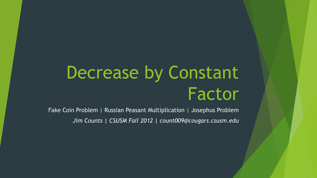 Divide coins into two equal sets of (/2) and place on balance If is odd then remove one random coin. The presence of the fake coin will tip the balance (it is lighter or heavier). If is odd and the sets are balanced then the fake coin is only coin not on the balance. Otherwise… When you know the fake is lighter, then the real-coin set is heavier. Remove the heavier set and repeat the search. If you don’t know if the relative weight of the fake coin, things get trickier… Metric: Number of Coins Basic Operation: Comparison Worst Case: = 2 + 1, > 1 1 = 0 Same as Binary Search = log2