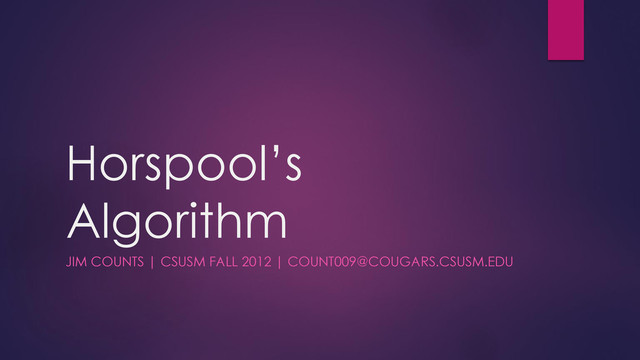 alphabet of pattern is a subset of the alphabet of the text), construct the shift table for the entire alphabet. 2. Align the pattern against the beginning of the text. 3. Starting with the last character in the pattern, compare the character in the text. On a match, compare the next character to the left trying to match them all. On a mismatch, look up the rightmost aligned character (not necessarily the mismatched character!) from the text in the shift table. Then shift the pattern to the right by the amount indicated in the shift table. Repeat until the text matches, or until the text cannot match because the pattern is longer than the remaining text.