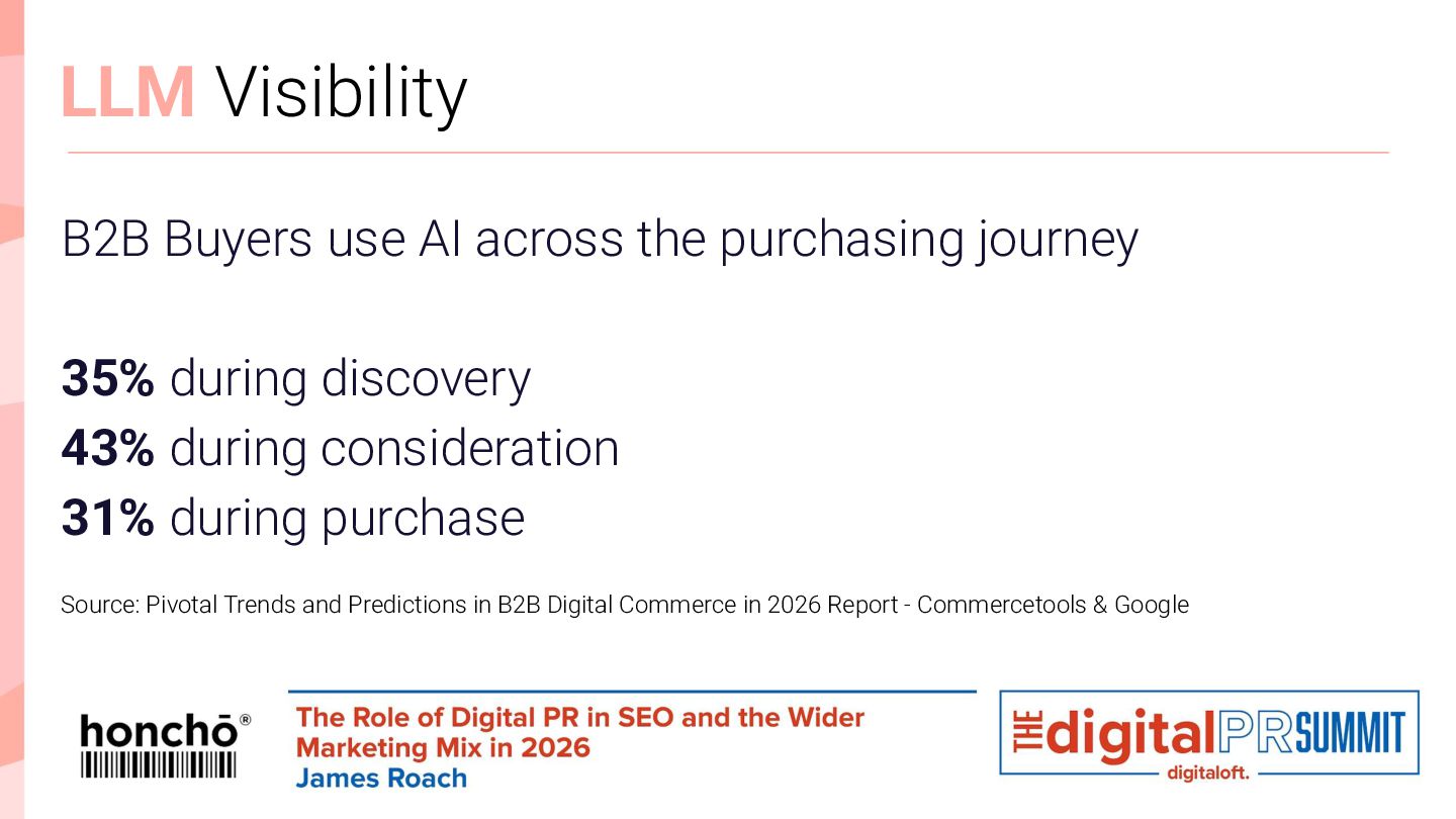 discovery 43% during consideration 31% during purchase Source: Pivotal Trends and Predictions in B2B Digital Commerce in 2026 Report - Commercetools & Google LLM Visibility