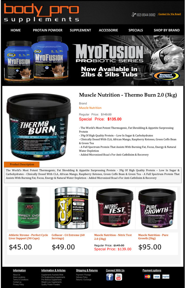 S SPECIALS SHOP BY BRAND Information About Us Store Locations Terms & Conditions Contact us Privacy Policy Information & Articles Supplements Australia Wide Pro Bodybuilding Supplements Pre Workout Supplements Weight Loss Supplements Quality Protein Powders Shipping & Returns Payment / Postage Delivery Policy Returns / Exchange Connect With Us Payment options Muscle Nutrition - Thermo Burn 2.0 (3kg) Brand Muscle Nutrition Regular Price: $149.00 Special Price: $135.00 - The World’s Most Potent Thermogenic, Fat Shredding & Appetite Surpressing Protein - 39g Of High Quality Protein – Low In Sugar & Carbohydrates - Clinically Dosed With CLA, African Mango, Raspberry Ketones, Green Coffe Bean & Green Tea - A Full Spectrum Protein That Assists With Burning Fat, Focus, Energy & Natural Water Depletion - Added Micronized Bcaa’s For Anti-Catbilisim & Recovery The World’s Most Potent Thermogenic, Fat Shredding & Appetite Surpressing Protein - 39g Of High Quality Protein – Low In Sugar & Carbohydrates - Clinically Dosed With CLA, African Mango, Raspberry Ketones, Green Coffe Bean & Green Tea - A Full Spectrum Protein That Assists With Burning Fat, Focus, Energy & Natural Water Depletion - Added Micronized Bcaa’s For Anti-Catbilisim & Recovery Product Description Athletic Xtreme - Perfect Cycle Liver Support (90 Caps) $45.00 Cellucor - C4 Extreme (60 Servings) $49.00 Muscle Nutrition - Nitric Test 2.0 (3kg) Regular Price: $149.00 Special Price: $139.00 Muscle Nutrition - Pure Growth (5kg) $95.00