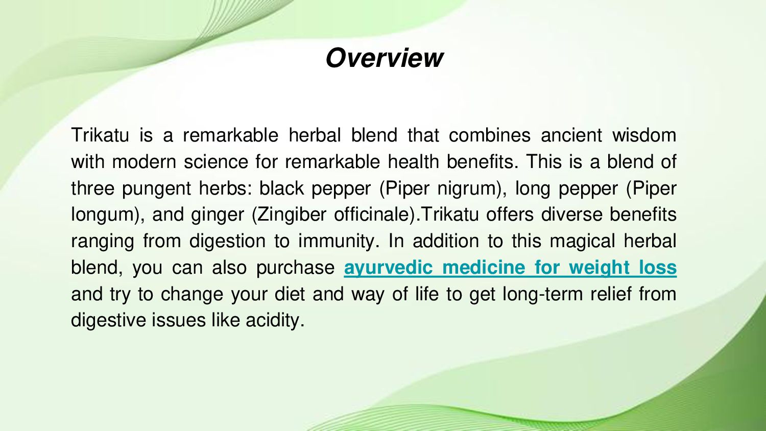 Trikatu is a remarkable herbal blend that combines ancient wisdom with modern science for remarkable health benefits. This is a blend of three pungent herbs: black pepper (Piper nigrum), long pepper (Piper longum), and ginger (Zingiber officinale).Trikatu offers diverse benefits ranging from digestion to immunity. In addition to this magical herbal blend, you can also purchase ayurvedic medicine for weight loss and try to change your diet and way of life to get long-term relief from digestive issues like acidity.