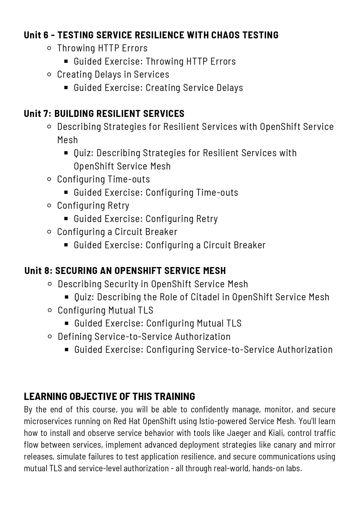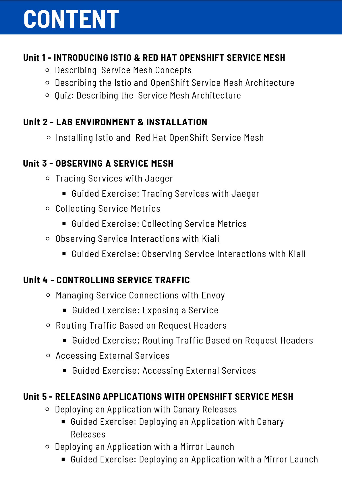 This course gives you deep, hands-on experience with service mesh on OpenShift, based on the curriculum of Red Hat’s DO328. You’ll walk through every major component of the Istio ecosystem, including Envoy proxies, control plane, Prometheus, Grafana, Kiali, and Jaeger, and apply those tools through real-world scenarios and lab exercises.