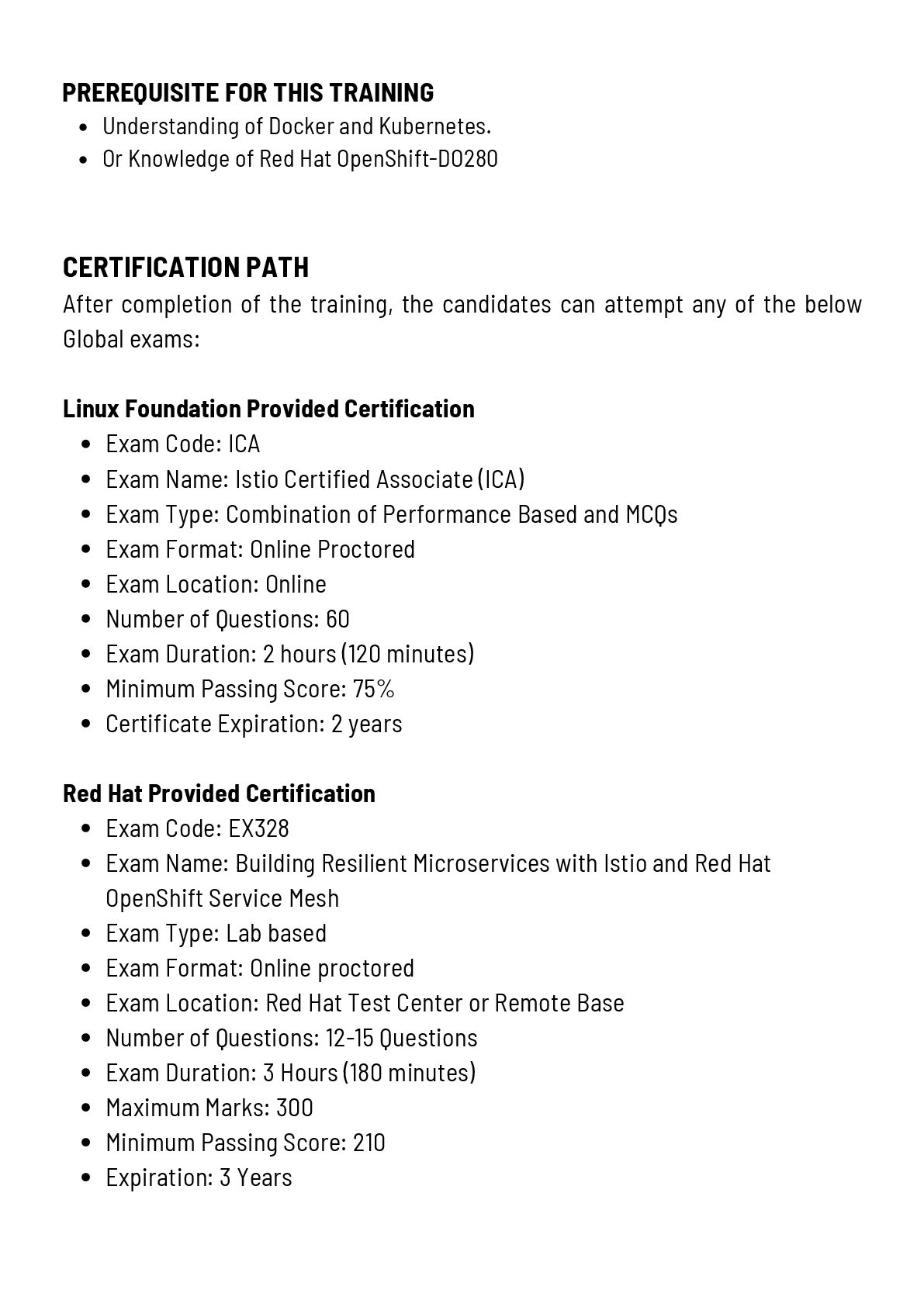 Throughout the training, you’ll learn to trace service behavior, control and route service traffic intelligently, test failure scenarios using chaos engineering, and apply security policies like mutual TLS and authorization across the mesh. Everything is designed to reflect real production environments, ensuring you’re ready for practical implementation or certification.