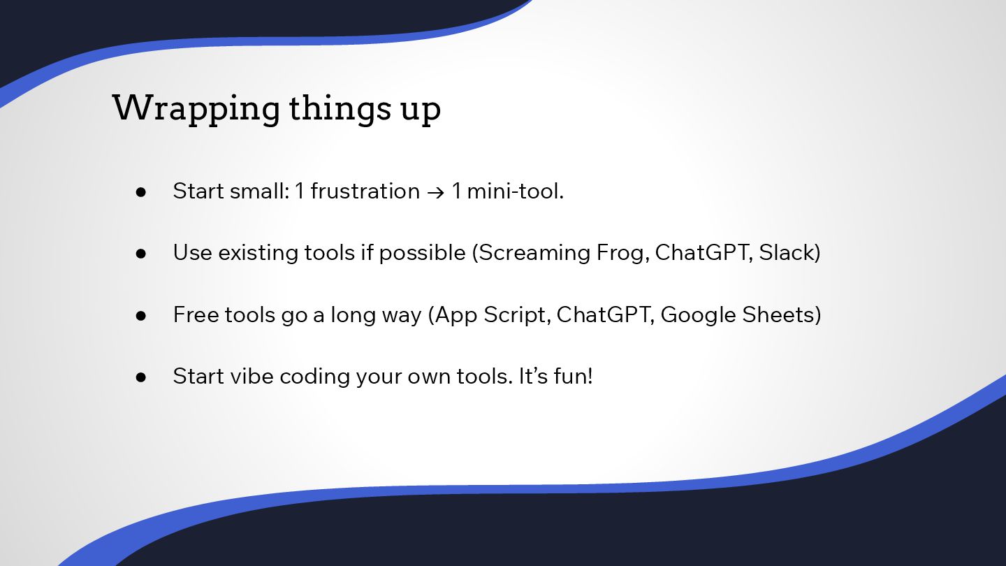 Many of the paid tools (usually enterprise) tools offer valuable automation capabilities for technical SEO, but they can cost a fortune. Furthermore, many of them employ a pricing strategy where 1 subscription covers just 1 site. Which means if you want to track multiple clients and a couple competitors, it becomes unaffordable entirely. But... you could make your own automations, with existing tools like Screaming Frog or with a little vibe coding. Anyone can do it, even non-coders.