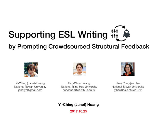 Huang National Taiwan University [email protected] Hao-Chuan Wang National Tsing Hua University [email protected] Jane Yung-jen Hsu National Taiwan University [email protected] 2017.10.25 Yi-Ching (Janet) Huang