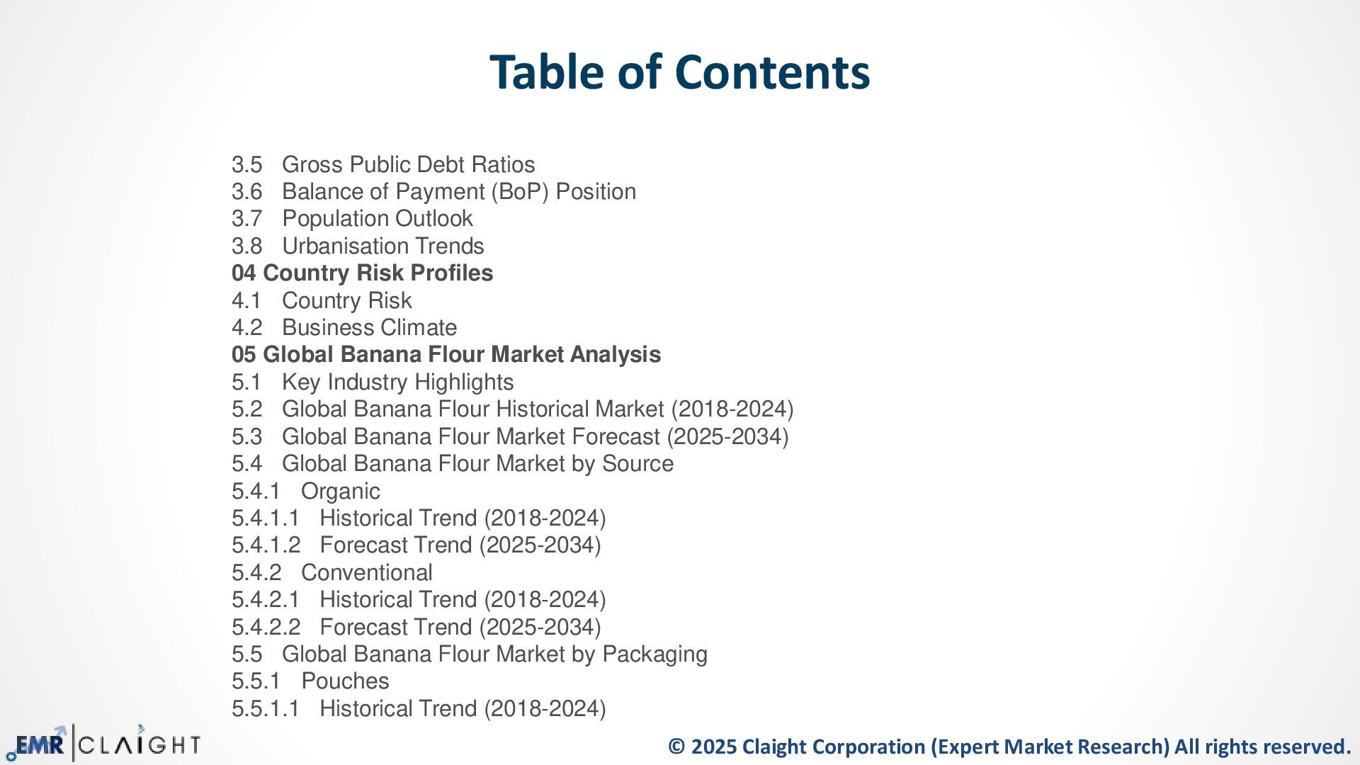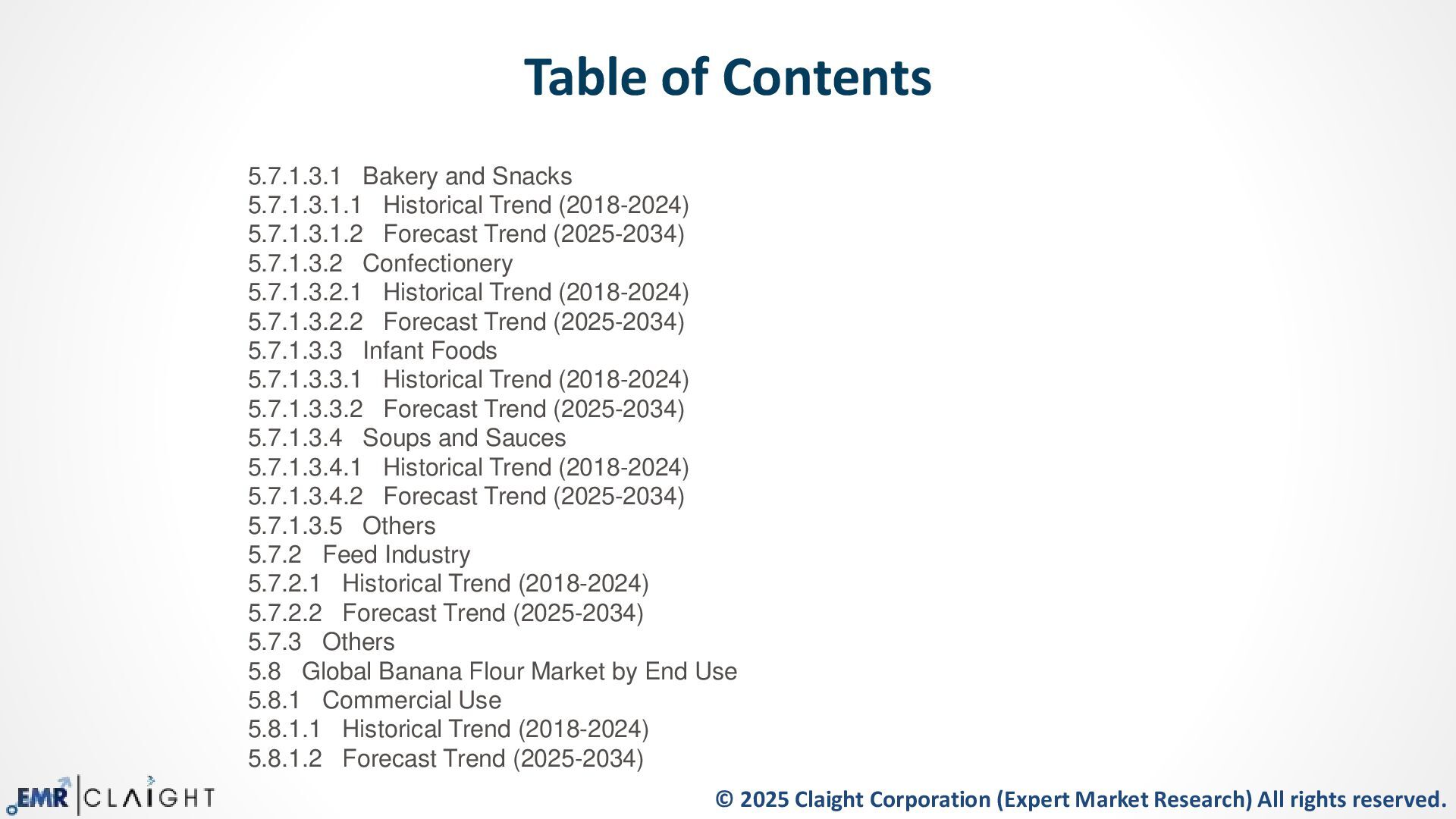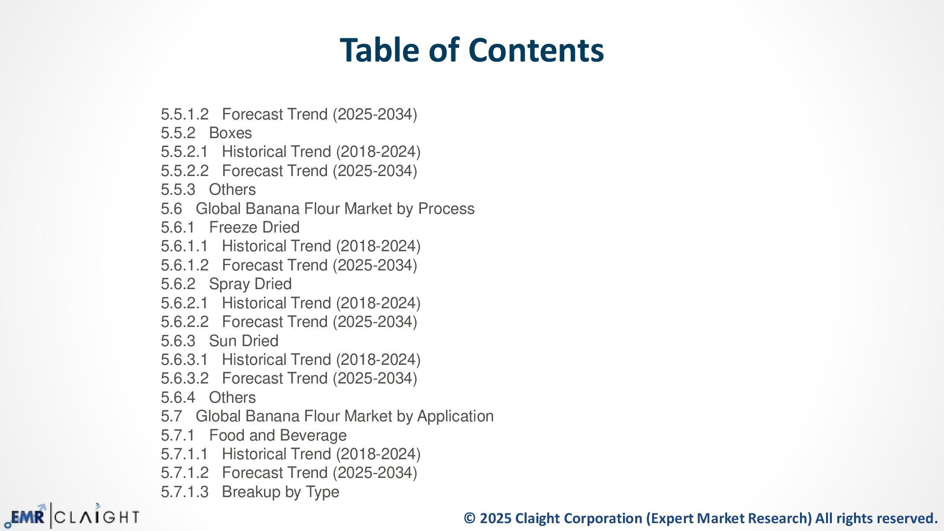Global Banana Flour Industry Segmentation 05 01 This is a sample text. Trade Data Analysis Based On the Source: • Organic • Conventional Based on the Packaging: • Pouches • Boxes • Others Based on the Process: • Freeze Dried • Spray Dried • Sun Dried • Others Based on the End Use: • Commercial Use • Residential Use 01 Trade Data Analysis Capacity Additions, Plant Turnarounds and Mergers Competitive Landscape Cost Analysis Demand Drivers Market Trade Data Analysis Additional Insights