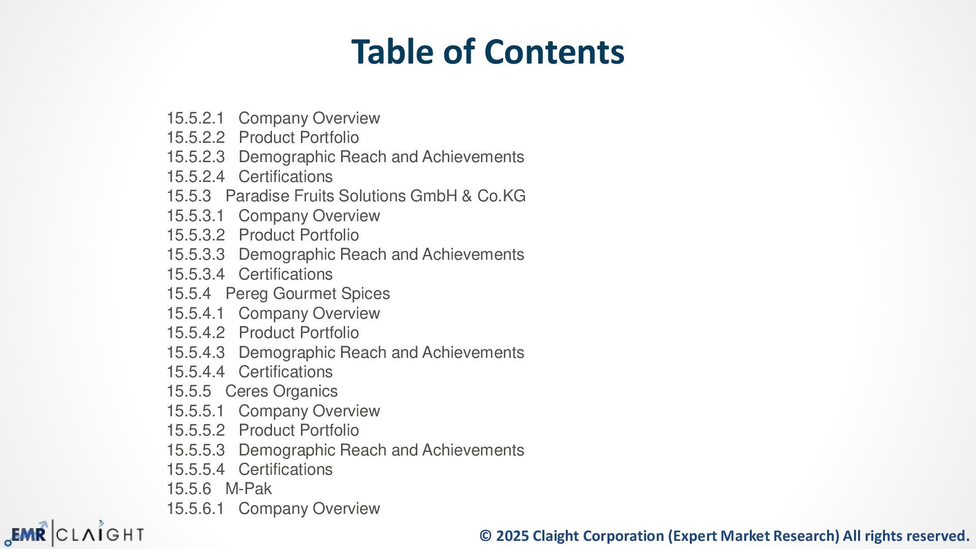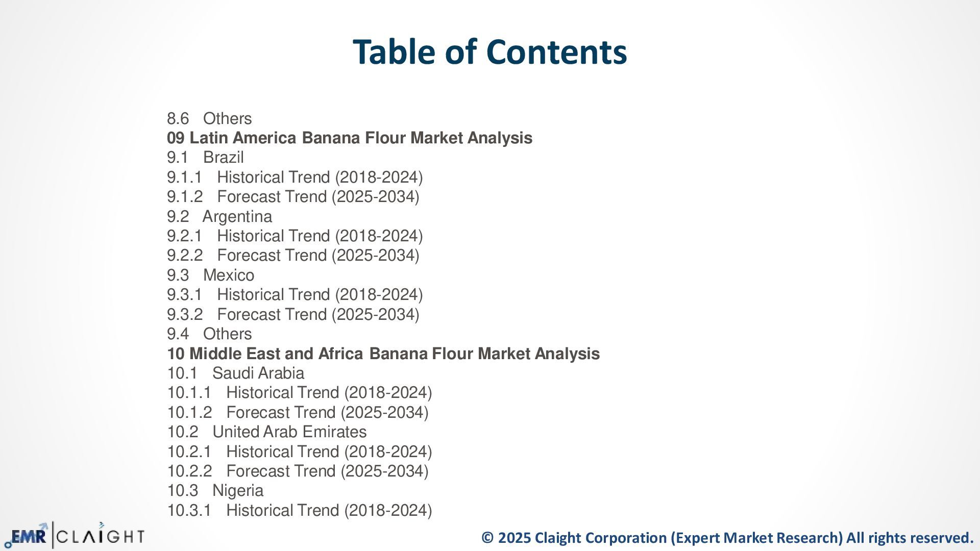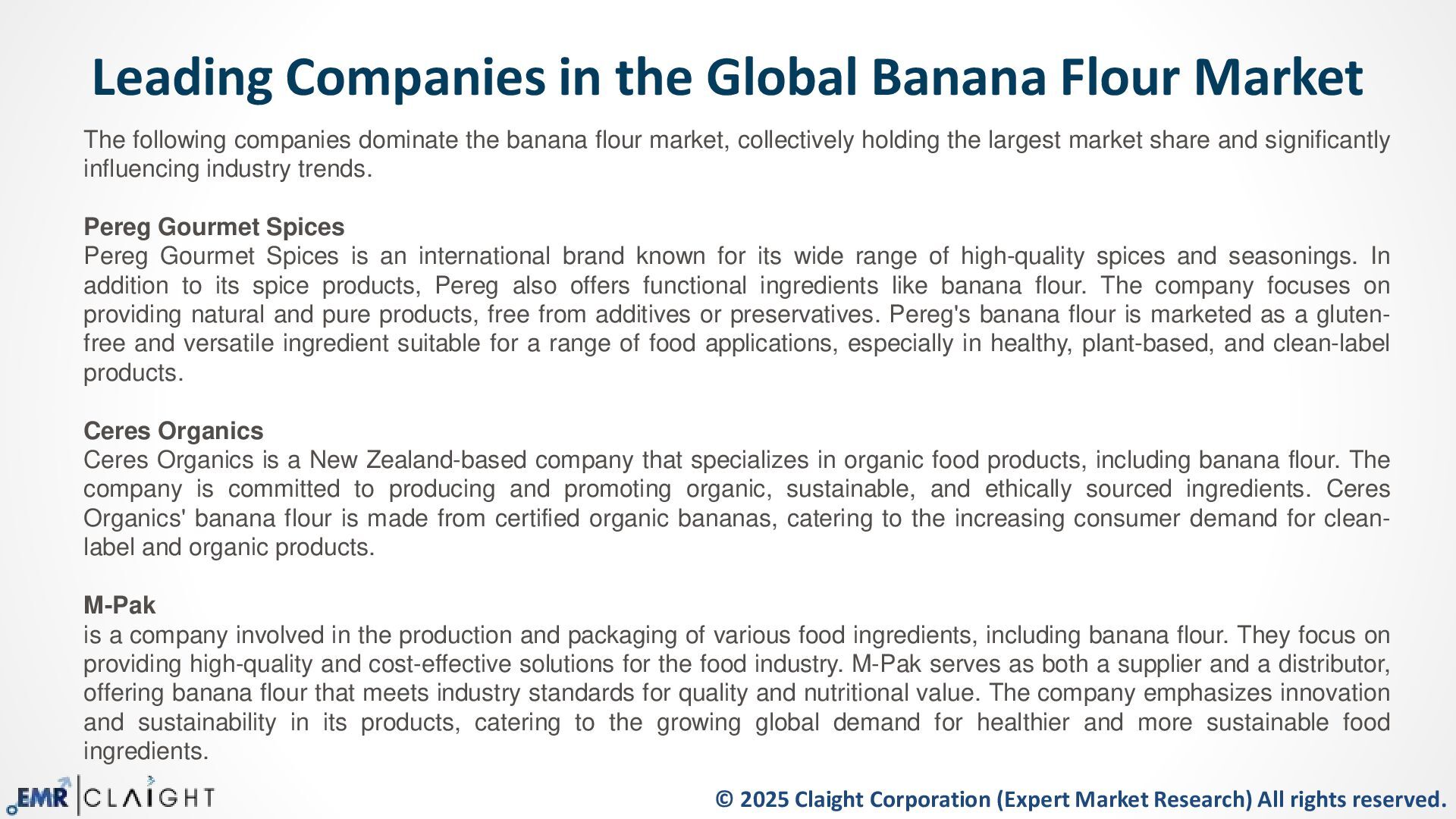 Leading Companies in the Global Banana Flour Market The following companies dominate the banana flour market, collectively holding the largest market share and significantly influencing industry trends. Pereg Gourmet Spices Pereg Gourmet Spices is an international brand known for its wide range of high-quality spices and seasonings. In addition to its spice products, Pereg also offers functional ingredients like banana flour. The company focuses on providing natural and pure products, free from additives or preservatives. Pereg's banana flour is marketed as a gluten- free and versatile ingredient suitable for a range of food applications, especially in healthy, plant-based, and clean-label products. Ceres Organics Ceres Organics is a New Zealand-based company that specializes in organic food products, including banana flour. The company is committed to producing and promoting organic, sustainable, and ethically sourced ingredients. Ceres Organics' banana flour is made from certified organic bananas, catering to the increasing consumer demand for clean- label and organic products. M-Pak is a company involved in the production and packaging of various food ingredients, including banana flour. They focus on providing high-quality and cost-effective solutions for the food industry. M-Pak serves as both a supplier and a distributor, offering banana flour that meets industry standards for quality and nutritional value. The company emphasizes innovation and sustainability in its products, catering to the growing global demand for healthier and more sustainable food ingredients.
