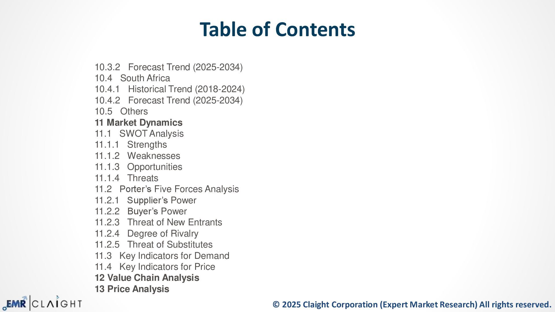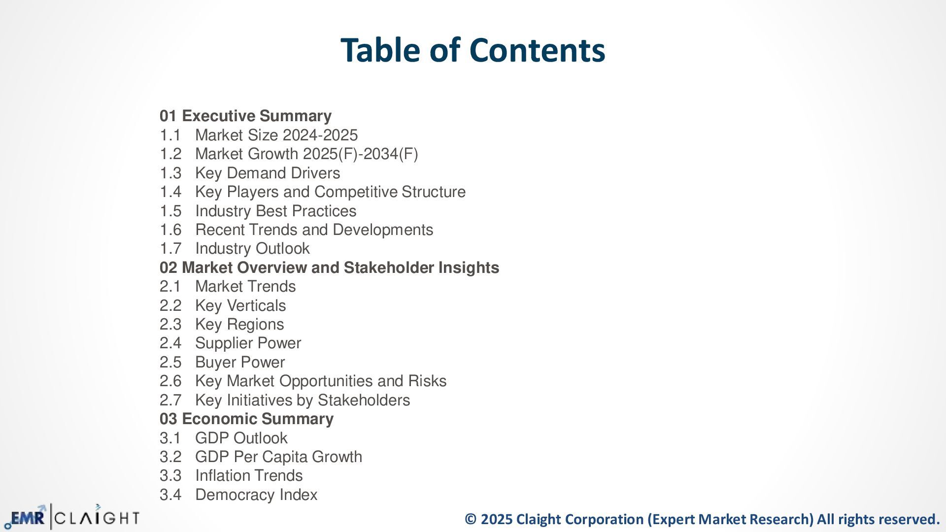 Table of Contents 01 Executive Summary 1.1 Market Size 2024-2025 1.2 Market Growth 2025(F)-2034(F) 1.3 Key Demand Drivers 1.4 Key Players and Competitive Structure 1.5 Industry Best Practices 1.6 Recent Trends and Developments 1.7 Industry Outlook 02 Market Overview and Stakeholder Insights 2.1 Market Trends 2.2 Key Verticals 2.3 Key Regions 2.4 Supplier Power 2.5 Buyer Power 2.6 Key Market Opportunities and Risks 2.7 Key Initiatives by Stakeholders 03 Economic Summary 3.1 GDP Outlook 3.2 GDP Per Capita Growth 3.3 Inflation Trends 3.4 Democracy Index