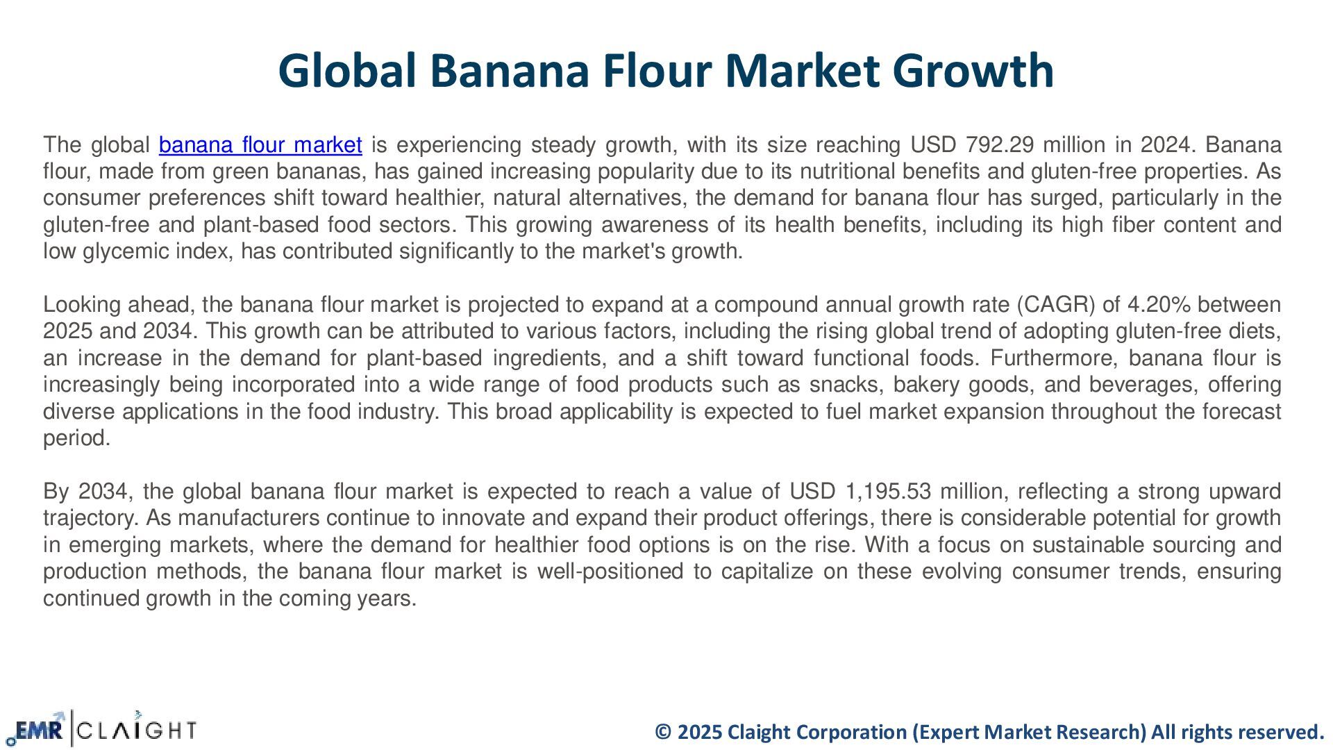 Global Banana Flour Market Growth 05 01 This is a sample text. Trade Data Analysis The global banana flour market is experiencing steady growth, with its size reaching USD 792.29 million in 2024. Banana flour, made from green bananas, has gained increasing popularity due to its nutritional benefits and gluten-free properties. As consumer preferences shift toward healthier, natural alternatives, the demand for banana flour has surged, particularly in the gluten-free and plant-based food sectors. This growing awareness of its health benefits, including its high fiber content and low glycemic index, has contributed significantly to the market's growth. Looking ahead, the banana flour market is projected to expand at a compound annual growth rate (CAGR) of 4.20% between 2025 and 2034. This growth can be attributed to various factors, including the rising global trend of adopting gluten-free diets, an increase in the demand for plant-based ingredients, and a shift toward functional foods. Furthermore, banana flour is increasingly being incorporated into a wide range of food products such as snacks, bakery goods, and beverages, offering diverse applications in the food industry. This broad applicability is expected to fuel market expansion throughout the forecast period. By 2034, the global banana flour market is expected to reach a value of USD 1,195.53 million, reflecting a strong upward trajectory. As manufacturers continue to innovate and expand their product offerings, there is considerable potential for growth in emerging markets, where the demand for healthier food options is on the rise. With a focus on sustainable sourcing and production methods, the banana flour market is well-positioned to capitalize on these evolving consumer trends, ensuring continued growth in the coming years.