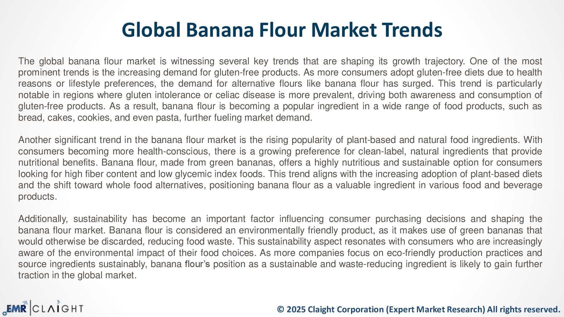 Global Banana Flour Market Trends 05 01 This is a sample text. Trade Data Analysis The global banana flour market is witnessing several key trends that are shaping its growth trajectory. One of the most prominent trends is the increasing demand for gluten-free products. As more consumers adopt gluten-free diets due to health reasons or lifestyle preferences, the demand for alternative flours like banana flour has surged. This trend is particularly notable in regions where gluten intolerance or celiac disease is more prevalent, driving both awareness and consumption of gluten-free products. As a result, banana flour is becoming a popular ingredient in a wide range of food products, such as bread, cakes, cookies, and even pasta, further fueling market demand. Another significant trend in the banana flour market is the rising popularity of plant-based and natural food ingredients. With consumers becoming more health-conscious, there is a growing preference for clean-label, natural ingredients that provide nutritional benefits. Banana flour, made from green bananas, offers a highly nutritious and sustainable option for consumers looking for high fiber content and low glycemic index foods. This trend aligns with the increasing adoption of plant-based diets and the shift toward whole food alternatives, positioning banana flour as a valuable ingredient in various food and beverage products. Additionally, sustainability has become an important factor influencing consumer purchasing decisions and shaping the banana flour market. Banana flour is considered an environmentally friendly product, as it makes use of green bananas that would otherwise be discarded, reducing food waste. This sustainability aspect resonates with consumers who are increasingly aware of the environmental impact of their food choices. As more companies focus on eco-friendly production practices and source ingredients sustainably, banana flour’s position as a sustainable and waste-reducing ingredient is likely to gain further traction in the global market.