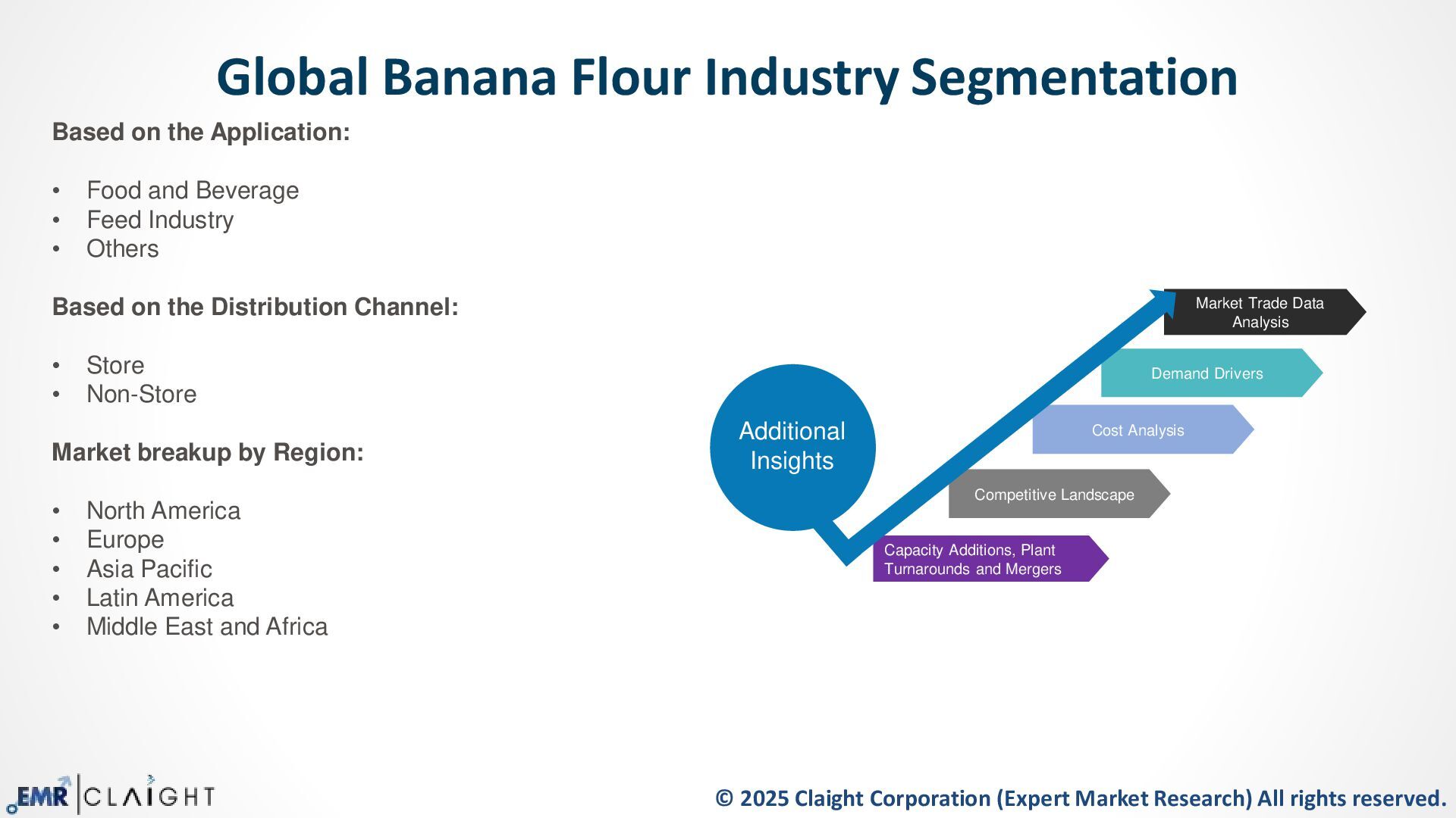 Global Banana Flour Industry Segmentation 05 01 This is a sample text. Trade Data Analysis Based on the Application: • Food and Beverage • Feed Industry • Others Based on the Distribution Channel: • Store • Non-Store Market breakup by Region: • North America • Europe • Asia Pacific • Latin America • Middle East and Africa 01 Trade Data Analysis Capacity Additions, Plant Turnarounds and Mergers Competitive Landscape Cost Analysis Demand Drivers Market Trade Data Analysis Additional Insights