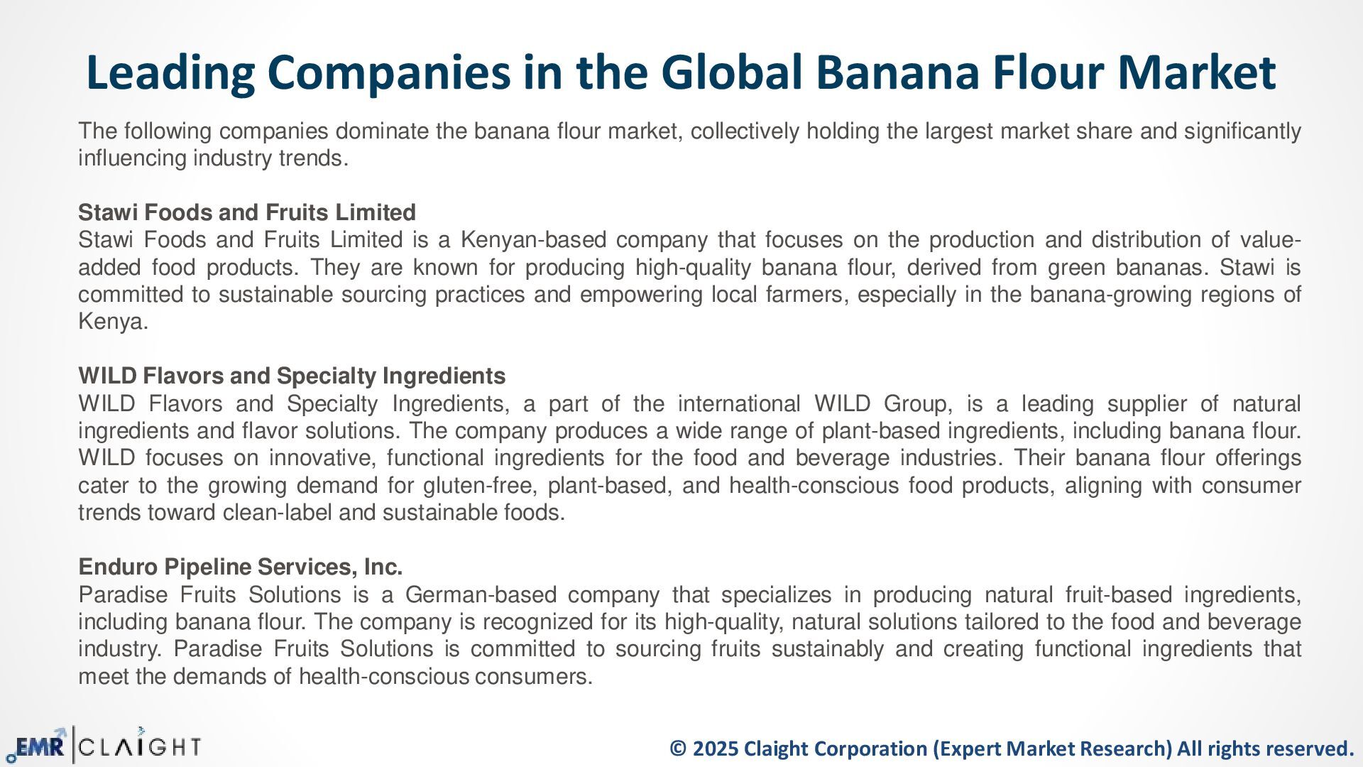 Leading Companies in the Global Banana Flour Market The following companies dominate the banana flour market, collectively holding the largest market share and significantly influencing industry trends. Stawi Foods and Fruits Limited Stawi Foods and Fruits Limited is a Kenyan-based company that focuses on the production and distribution of value- added food products. They are known for producing high-quality banana flour, derived from green bananas. Stawi is committed to sustainable sourcing practices and empowering local farmers, especially in the banana-growing regions of Kenya. WILD Flavors and Specialty Ingredients WILD Flavors and Specialty Ingredients, a part of the international WILD Group, is a leading supplier of natural ingredients and flavor solutions. The company produces a wide range of plant-based ingredients, including banana flour. WILD focuses on innovative, functional ingredients for the food and beverage industries. Their banana flour offerings cater to the growing demand for gluten-free, plant-based, and health-conscious food products, aligning with consumer trends toward clean-label and sustainable foods. Enduro Pipeline Services, Inc. Paradise Fruits Solutions is a German-based company that specializes in producing natural fruit-based ingredients, including banana flour. The company is recognized for its high-quality, natural solutions tailored to the food and beverage industry. Paradise Fruits Solutions is committed to sourcing fruits sustainably and creating functional ingredients that meet the demands of health-conscious consumers.