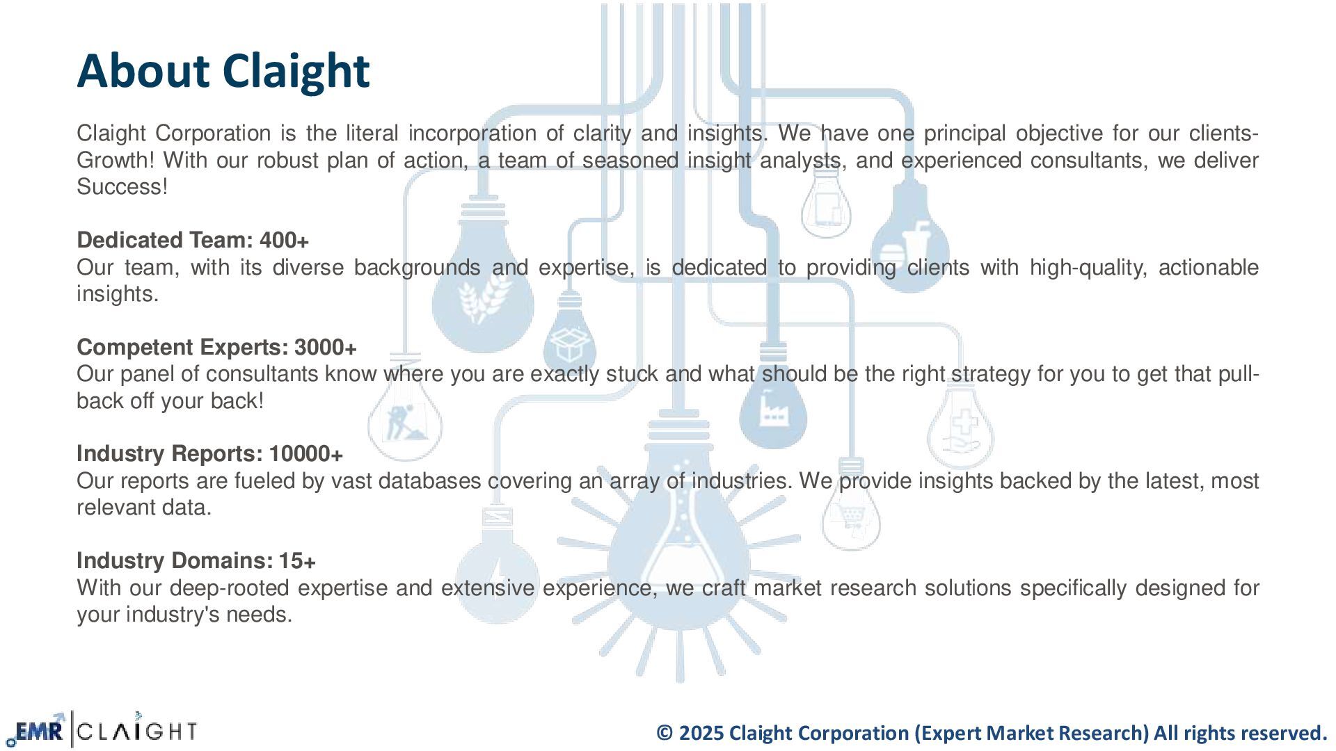 About Claight Claight Corporation is the literal incorporation of clarity and insights. We have one principal objective for our clients- Growth! With our robust plan of action, a team of seasoned insight analysts, and experienced consultants, we deliver Success! Dedicated Team: 400+ Our team, with its diverse backgrounds and expertise, is dedicated to providing clients with high-quality, actionable insights. Competent Experts: 3000+ Our panel of consultants know where you are exactly stuck and what should be the right strategy for you to get that pull- back off your back! Industry Reports: 10000+ Our reports are fueled by vast databases covering an array of industries. We provide insights backed by the latest, most relevant data. Industry Domains: 15+ With our deep-rooted expertise and extensive experience, we craft market research solutions specifically designed for your industry's needs.