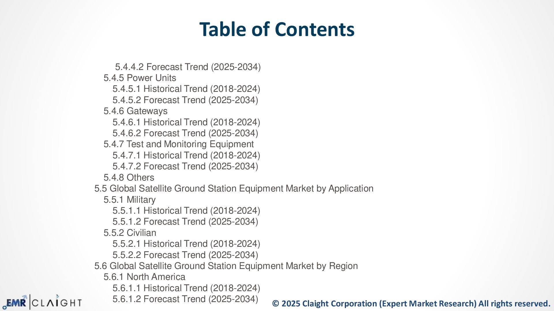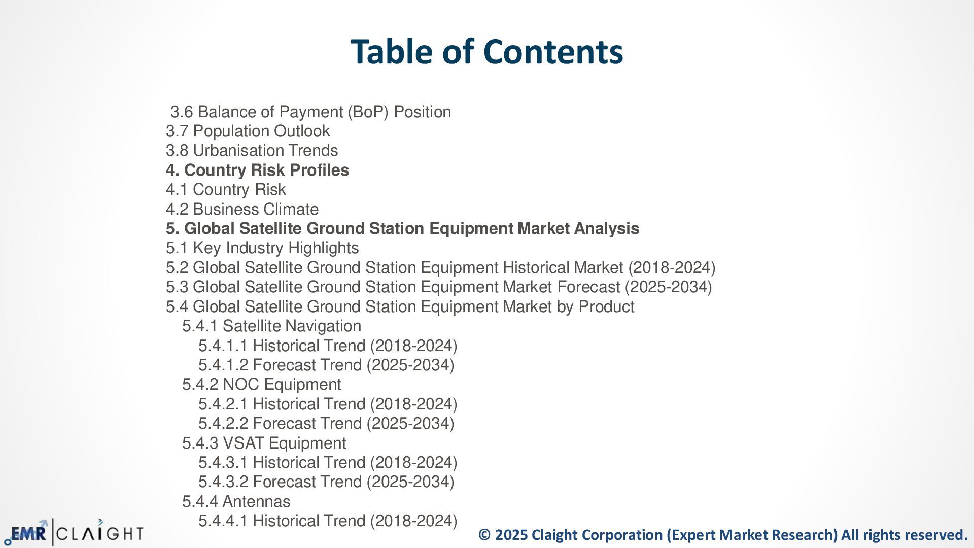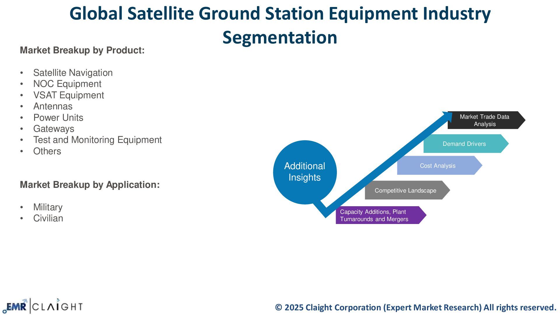 Global Satellite Ground Station Equipment Industry Segmentation 05 01 This is a sample text. Trade Data Analysis Market Breakup by Product: • Satellite Navigation • NOC Equipment • VSAT Equipment • Antennas • Power Units • Gateways • Test and Monitoring Equipment • Others Market Breakup by Application: • Military • Civilian 01 Trade Data Analysis Capacity Additions, Plant Turnarounds and Mergers Competitive Landscape Cost Analysis Demand Drivers Market Trade Data Analysis Additional Insights